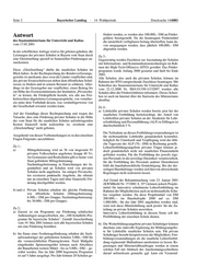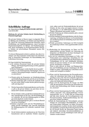 Bayerischer Landtag 14. Wahlperiode Drucksache 14/6881 12.06.2001 Schriftliche Anfrage wird, sollten auch die Fördermöglichkeiten für private Schulen, die hier schon seit langem intensive Leistun- der Abgeordneten Paulig BÜNDNIS 90 DIE GRÜNEN gen erbringen z.T. mit ABM-Kräften und ehrenamtlich vom 02.04.2001 Tätigen, überarbeitet und gestärkt werden. a) Welche Förderung der Schulsozialarbeit gibt es derzeit Stärkung der privaten Schulen durch Gleichstellung in für private Schulen? Finanzierungsfragen b) Welche künftigen Fördermöglichkeiten sieht die Staats- regierung, um künftig den Einsatz von SozialarbeiterIn- Die privaten Schulen in Bayern tragen in prägender Weise nen und BetreuerInnen im Schulalltag an privaten Schu- zur Bildung und Ausbildung von Kindern und Jugendlichen len zu stärken? bei. Durch die Umsetzung pädagogischer Reformen, durch c) Welche gesetzlichen Änderungen im EUG bezüglich Profilbildung und Qualitätsmanagement, durch besondere des Sonderungsverbotes wären gegebenenfalls notwen- Organisationsangebote wie Mittags- und Nachmittagsange- dig? bote, durch Ausprägung von Wertegemeinschaften sind die- se Schulen ein unverzichtbarer Bestandteil unseres Bil- 6. a) Beabsichtigt die Staatsregierung, im Sinne von Pla- dungssystems. nungssicherheit privaten Schulen zur Umsetzung der Integration von Behinderten ein festes Kontingent von Vor diesem Hintergrund erscheint es geboten, dass diese Lei- SonderschullehrerInnen zuzuteilen? stungen vom Staat anerkannt werden durch eine Gleichstel- b) Da sich bei LehrerInnen-Zuweisungen an Volks- und lung, in finanziellen Förderungen, bei Klassenbildung und Förderschulen trotz rechtzeitiger Anmeldung der vor- LehrerInnen-Zuweisung. aussichtlichen Klassenbildung bei den Regierungen, die Verhandlungen oft bis zum Schulbeginn hinziehen, Ich frage deshalb die Staatsregierung: können die privaten Schulen oft erst zum Schulanfang 1. a) Zu welchem Prozentsatz bieten die privaten Schulen private Anstellungen vornehmen. Mittags- und Nachmittagsbetreuung an (bitte gegliedert Wäre es nicht sinnvoll, im Sinne von Planungssicher- nach Schultypen)? heit und Profilbildung privaten Schulträgern die Mög- b) Welche Förderungen werden hierfür derzeit gezahlt? lichkeit zu geben, eigenständig die LehrerInnen auszu- c) Gibt es in der Staatsregierung Überlegungen, diese be- suchen und vertraglich zu binden? sonderen Betreuungsleistungen finanziell angemessen zu unterstützen? 7. a) Wann wird die Staatsregierung den Personalkostenzu- schuss für Lehrerinnen und Lehrer in der Bemessens- 2. a) Warum gelten die Programme zur Schulhofgestaltung grundlage an das echte Alter der Lehrkräfte angleichen? und Schulhofbegrünung nicht auch für private Schulen? b) Wann wird die Staatsregierung im Personalkostenzu- b) Welche Fördersätze gibt es derzeit für staatliche Schu- schuss die Kinderzahl berücksichtigen? len und welche Mittel werden hierfür jährlich bereitge- c) Wann wird die Staatsregierung die Zusage von März stellt und abgerufen? 1999, die pauschalierte Zuweisung eine Dienstaltersstu- fe höher unter Einbeziehung eines Kindes auszugestal- 3. Welche finanziellen Fördermöglichkeiten und Zuschüs- ten, umsetzen? se gibt es für private Schulen, um auch diese mit mo- dernen EDV-Geräten auszustatten? 8. a) Wann wird die Staatsregierung bei Volks- und Förder- schulen angesichts eines durchschnittlichen Verwal- 4. Private Schulen stellen gemäß ihrem Schulprofil beson- tungsaufwands von ca. 35.000 DM pro Förderschule dere Anforderungen an die Fort- und Weiterbildung ih- und Jahr einen Zuschuss für Verwaltungskosten (z.B. rer Lehrkräfte, die mit dem Bildungsangebot in Dillin- Personalverwaltung, Sachkostenabrechnung) den Trä- gen nicht abgedeckt werden können. gern freier Schulen gewähren? a) Welche Fördermöglichkeiten gibt es in diesem Bereich b) Sieht die Staatsregierung die Notwendigkeit, privaten für private Schulträger? Schulen bei notwendigen Baumaßnahmen an Volks- b) Könnten umgekehrt nicht auch die Weiterbildungsan- und Förderschulen Entlastung von hohen Zwischenfi- gebote privater Schulträger eine sinnvolle Ergänzung nanzierungskosten zu geben, da diese durch nachträgli- der Bildungsangebote für Lehrkräfte staatlicher Schu- che und häufig verzögerte Bezuschussung bereits bei 30 len sein? bis 40 Prozent Kosten der Bausumme liegen können und dadurch notwendige Investitionsmaßnahmen an 5. Da die Schulsozialarbeit zunehmend aus der Tabu-Ecke privaten Schulen von den Schulträgern nicht mehr ge- herauskommt und an staatlichen Schulen ausgebaut schultert werden können?