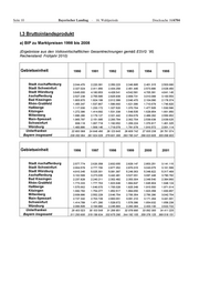 Seite 10 Bayerischer Landtag · 16. Wahlperiode Drucksache 16/6704 I.3 Bruttoinlandsprodukt a) BIP zu Marktpreisen 1998 bis 2008 (Ergebnisse aus den Volkswirtschaftlichen Gesamtrechnungen gemäß ESVG `95; Rechenstand: Frühjahr 2010) Gebietseinheit 1990 1991 1992 1993 1994 1995 Stadt Aschaffenburg 2.044.476 2.220.391 2.350.223 2.346.895 2.401.315 2.503.680 Stadt Schweinfurt 2.327.024 2.411.956 2.434.258 2.451.445 2.573.896 2.629.450 Stadt Würzburg 3.845.000 4.180.953 4.428.541 4.542.581 4.705.391 4.841.145 Aschaffenburg 2.527.238 2.755.585 2.925.939 2.909.731 3.010.089 3.100.553 Bad Kissingen 1.803.970 1.924.199 2.012.399 2.040.470 2.104.090 2.178.374 Rhön-Grabfeld 1.455.347 1.537.867 1.586.660 1.621.096 1.710.679 1.746.820 Haßberge 1.117.030 1.233.172 1.327.520 1.370.704 1.477.505 1.530.586 Kitzingen 1.272.396 1.414.692 1.531.338 1.548.535 1.629.854 1.661.950 Miltenberg 1.996.286 2.179.127 2.321.442 2.354.679 2.489.292 2.556.952 Main-Spessart 1.965.797 2.151.685 2.293.794 2.362.704 2.539.638 2.639.625 Schweinfurt 938.118 1.067.718 1.192.652 1.269.224 1.376.917 1.401.325 Würzburg 1.400.886 1.569.145 1.719.079 1.791.678 1.916.572 2.001.114 Unterfranken 22 693 568 24 646 490 26 123 845 26 609 742 27 935 238 28 791 574 Bayern insgesamt 239 352 064 261 924 029 279 601 395 283 785 347 296 023 605 305 098 803 Gebietseinheit 1996 1997 1998 1999 2000 2001 Stadt Aschaffenburg 2.577.774 2.626.358 2.832.655 2.829.147 2.853.251 3.141.115 Stadt Schweinfurt 2.664.578 2.777.706 2.877.352 2.876.015 3.043.075 3.161.589 Stadt Würzburg 4.910.345 5.025.301 5.081.397 5.249.363 5.348.822 5.317.469 Aschaffenburg 3.162.589 3.273.035 3.442.491 3.527.651 3.697.448 3.790.782 Bad Kissingen 2.237.828 2.240.211 2.302.492 2.353.304 2.349.540 2.384.960 Rhön-Grabfeld 1.773.333 1.777.763 1.823.949 1.884.847 1.945.904 1.948.124 Haßberge 1.575.662 1.646.670 1.705.028 1.825.349 1.915.550 1.971.614 Kitzingen 1.682.782 1.754.277 1.852.517 1.894.650 1.923.358 1.930.857 Miltenberg 2.609.996 2.552.229 2.646.754 2.706.354 2.756.296 3.042.754 Main-Spessart 2.727.342 2.763.729 2.960.651 3.091.210 3.171.294 3.441.001 Schweinfurt 1.414.789 1.471.290 1.528.672 1.578.396 1.654.632 1.658.238 Würzburg 2.066.505 2.194.980 2.245.893 2.260.394 2.433.130 2.622.722 Unterfranken 29 403 523 30 103 549 31 299 851 32 076 680 33 092 300 34 411 225 Bayern insgesamt 311 293 600 319 156 634 332 675 280 344 192 105 359 376 125 369 518 151