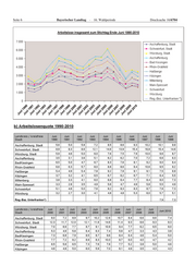 Seite 6 Bayerischer Landtag · 16. Wahlperiode Drucksache 16/6704 b) Arbeitslosenquote 1990-2010 Landkreis / kreisfreie Juni Juni Juni Juni Juni Juni Juni Juni Juni Juni Stadt 1990 1991 1992 1993 1994 1995 1996 1997 1998 1999 Aschaffenburg, Stadt 5,6 5,0 5,8 7,2 8,5 8,6 9,3 10,2 10,1 9,9 Schweinfurt, Stadt 8,9 8,3 8,6 12,1 14,6 13,9 15,4 16,8 15,4 14,6 Würzburg, Stadt 5,9 4,6 5,0 6,0 7,6 7,5 7,9 10,0 9,6 8,7 Aschaffenburg 3,5 3,1 3,6 5,1 6,2 6,2 7,0 7,2 6,6 6,3 BadKissingen 6,5 5,0 4,7 6,7 8,3 7,6 8,1 9,2 9,0 8,4 Rhön-Grabfeld 6,6 6,3 5,7 8,0 8,8 8,6 9,4 10,6 9,5 9,2 Haßberge 5,4 4,9 5,4 7,8 9,2 7,8 9,1 9,1 7,5 6,9 Kitzingen 3,7 3,2 4,1 6,5 6,7 6,2 6,7 7,1 6,4 5,5 Miltenberg 3,8 3,3 4,1 6,0 6,8 6,4 7,7 8,4 8,0 7,3 Main-Spessart 3,3 2,8 3,5 4,9 5,6 4,7 4,9 5,8 5,5 4,9 Schweinfurt 5,1 4,8 5,0 7,6 9,2 8,3 8,3 8,7 7,8 7,3 Würzburg 3,2 2,7 3,0 4,1 4,8 4,8 5,3 6,0 5,7 5,1 Reg.-Bez. Unterfranken*) 7,9 7,3 Landkreis / kreisfreie Juni Juni Juni Juni Juni Juni Juni Juni Juni Juni Juni 2010 Stadt 2000 2001 2002 2003 2004 2005 2006 2007 2008 2009 Aschaffenburg, Stadt 8,0 7,2 8,9 9,7 10,2 12,6 10,7 8,4 6,6 8,6 7,4 Schweinfurt, Stadt 12,3 11,7 12,0 12,1 11,6 14,6 11,4 9,3 8,6 9,3 8,3 Würzburg, Stadt 7,0 6,9 7,7 8,7 9,1 10,9 9,4 7,7 6,2 6,5 6,0 Aschaffenburg 5,3 4,9 5,8 6,4 6,3 7,4 5,9 4,7 3,3 4,3 3,9 BadKissingen 7,3 6,8 7,9 8,5 8,7 9,6 8,4 6,4 4,6 5,4 5,0 Rhön-Grabfeld 7,7 7,2 8,2 8,9 8,3 10,0 8,7 6,0 4,0 4,7 4,2 Haßberge 6,5 5,8 6,5 7,3 7,6 7,8 7,7 5,2 3,9 5,0 4,6 Kitzingen 4,6 4,8 5,0 6,0 5,9 7,0 6,1 4,9 3,5 4,3 4,3