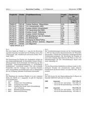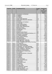 Seite 4 Bayerischer Landtag · 16. Wahlperiode Drucksache 16/7068 -4- Projekt-Nr. Straße Projektbezeichnung Projekt- Gesamt-kos- typ * ten (netto inkl. Grund- erwerb und Kos- ten Dritter) [Tsd. € ] PA690-07 St2148 Ausbau Saulburg - Wiesenfelden AUS 1.300 PA700-07 St2319 OU Untergriesbach (ABZ) OU 9.860 PA710-07 St2320 Ausbau nördlich Untergriesbach AUS 2.070 PA720-07 St2320 OU Hauzenberg-Süd (ABZ) OU 10.704 PA730-07 St2326 Ausbau Konzell - Rattenberg AUS 3.242 PA740-07 St2326 Ausbau nördlich Viechtach AUS 4.662 PA760-07 St2619 BÜ-Beseitigung in der OD Sulzbach BUE 1.597 PA770-07 St2632 OU Böhmzwiesel OU 3.850 PA780-07 St2110 Verlegung bei Moos/Tutting VER 1.440 PA900-07 St3000 Neubau Jahrdorf - Schönau - Wegscheid NEU 40.000 PA901-07 St3000 OU Wegscheid OU 6.570 * siehe Antwort zu 3. Zu 2.: Zu 4.: zu 2:Spalte der Tabelle zu 1. zeigt die der Bewertung Die letzte Die Verkehrsbelastungen basieren auf der Verkehrsprogno- zugrunde liegenden Gesamtkosten der Projekte (netto ohne se 2025 des Bayerischen Staatsministeriums für Wirtschaft, Die letzte Umsatzsteuer, Spalte inkl. der Tabelle Grunderwerb zu 1. Dritter, und Kosten zeigt die der Bewertung Preis- Infrastruktur,zugrunde Verkehr und liegenden Technologie, projektspezifischen stand: 2009). Verkehrsuntersuchungen. Die Bewertung der Projekte ist Gesamtkosten der Projekte (netto ohne Umsatzsteuer, inkl. Grunderwerb und Kos- noch nicht endgültig abgeschlossen. Die Daten zu den Ver- Die Finanzierung der Projekte des ten Dritter, Preisstand: 2009).Ausbauplans erfolgt aus kehrsbelastungen auf den Ortsumfahrungen liegen noch dem Staatsstraßenhaushalt. In Einzelfällen können Ortsum- nicht vollständig vor. fahrungsprojekte durch Gemeinden mit Förderung aus dem Programm „Staatsstraßenumfahrungen in gemeindlicher Zu 5.: Die Finanzierung Sonderbaulast“ derwerden. verwirklicht Projekte Überdes Ausbauplans eine eventuelle erfolgt Von deraus dem Staatsstraßen- Bayerischen Straßenbauverwaltung werden in Nie- Förderhöhe wird bei Vorliegen eines baureifen Projektes derbayern Projekte mit Gesamtkosten (netto inklusive haushalt. In Einzelfällen können Ortsumfahrungsprojekte nach Antragstellung einzelfallbezogen und in Abhängigkeit durch Gemeinden mit Grunderwerb und Kosten Dritter) von rund 530 Mio. € un- der zur Verfügung aus Förderung stehenden dem Fördermittel Programmentschieden. tersucht. „Staatsstraßenumfahrungen in gemeindlicher Son- Zu 3.:derbaulast“ verwirklicht werden. Über eine eventuelle Zu 6.: Förderhöhe wird bei Vorlie- Der Projekttyp der einzelnen Projekte ist in der vorletzten Der Soll-Ansatz für den Staatsstraßenausbau in Bayern im Spaltegen der eines Tabellebaureifen Projektes zu 1. angegeben. nach Es gibt dieAntragstellung folgenden einzelfallbezogen Haushalt 2009/2010 stelltundsichin Ab- wie folgt dar: sechshängigkeit Projekttypen:der zur Verfügung stehenden Fördermittel entschieden. • AUS: Ausbau 2009 insgesamt 218,5 Mio. € • OU: Neubau einer Ortsumfahrung - davon für Um- und Ausbau 103,5 Mio. € • VER: Verlegung einer Straße - davon für Bestandserhaltung 115,0 Mio. € • NEU:zu 3: Neubau einer Straße (nicht Ortsumfahrung oder Verlegung) 2010 insgesamt 191,5 Mio. € • BUE:Der Projekttyp der einzelnen Bahnübergangsbeseitigung Projekte ist in der vorletzten Spalte der Tabelle zu 1. - davon für Um- und Ausbau 102,5 Mio. € • BRU: Bauwerkserneuerung angegeben. Es gibt die folgenden sechs Projekttypen: - davon für Bestandserhaltung 89,0 Mio. € AUS: Ausbau OU: Neubau einer Ortsumfahrung VER: Verlegung einer Straße NEU: Neubau einer Straße (nicht Ortsumfahrung oder Verlegung) BUE: Bahnübergangsbeseitigung BRU: Bauwerkserneuerung zu 4: Die Verkehrsbelastungen basieren auf der Verkehrsprognose 2025 des Bayeri- schen Staatsministeriums für Wirtschaft, Infrastruktur, Verkehr und Technologie,