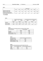 Seite 4 Bayerischer Landtag · 14. Wahlperiode Drucksache 14/1636 Tabelle 1: Regierungsbezirk OBB NDB OPF OFR MFR UFR SCHW BY Gesamtzahl der erteilten Stunden EBSU/DSU im Schuljahr 1997/98 3.338 782 1.324 1.340 1.182 1.051 2.023 11.0401) Gesamtzahl der erteilten Stunden EBSU und DSU im Schuljahr 1998/99 in Jgst. 5–10 1.551 450 530 876 617 741 1.004 5.7692) 1) 36 % der Sollstunden 2) 19 % der Sollstunden Tabelle 2: hauptamtlich erteilte Wochenstunden nebenamtlich/nebenberuflich erteilte Wochenstunden 1998/99 1997/98 1998/99 1997/98 Stunden % Stunden % Stunden % Stunden % Hauptschule 2.861 49,6 9.330 84,5 2.908 50,4 1.710 15,5 Realschule (staatlich) 597 72,8 1.096 100 223 27,2 – – Gymnasien (staatlich) 3.842 64,3 6.467 87,3 2.133 35,7 940 12,7 Tabelle 3: Zahl der Sportklassen in den verschiedenen Schularten in den Schuljahren 1997/98 und 1998/99 Schulart/Jahrgangsstufen Zahl der Sportklassen 1997/98 1998/99 Grundschule 21.870 21.894 Hauptschule 15.321 15.000 Realschule (staatlich) 7.–10. Jgst. 4.181 4.291 Gymnasium (staatlich) 5.–11. Jgst. 9.150 9.252 Tabelle 4: Schulart/Jahrgangsstufe tatsächlich erteilter Sportunterricht absolut (Wstd.) Grundschule (1.–4. Jgst.) 57 796 Hauptschule (5.–10. Jgst.) 35.418 Realschule (staatlich) (7.–10. Jgst). 9.402 Gymnasium (staatlich) (5.–11. Jgst.) 24.478 Tabelle 5: Beteiligung an den Mannschaftswettbewerben JUGEND TRAINIERT FÜR OLYMPIA Schuljahr Zahl der teilnehmenden Schüler Zahl der teilnehmenden Mannschaften 1996/97 153.878 15.511 1997/98 131.170 13.947 Minderung 22.708 1.564