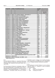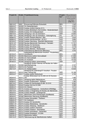 Seite 4 Bayerischer Landtag · 16. Wahlperiode Drucksache 16/6862 -4- Projekt-Nr. Straße Projektbezeichnung Projekt- Gesamtkosten Gesamt-kos- typ * ten Grund- (netto inkl. (netto erwerbinkl. und Grund- Kos- erwerb und Kos- ten Dritter) ten Dritter) [Tsd. € ] [Tsd. ] WUE082-07 St2271 OU Volkach-Gaibach - Ostvariante 2.1 OU 11.920 WUE090-07 St2272 Ausbau der OD Kitzingen AUS 1.030 WUE105-07 St2273 Erneuerung Mainbrücke Segnitz BRU 8.497 WUE110-07 St2294 Ausbau südlich Gramschatz AUS 1.040 WUE120-07 St2294 Ausbau südlich Rimpar AUS 2.295 WUE130-07 St2297 Ausbau westlich Unteraltertheim AUS 2.310 WUE140-07 St2297 Ausbau der OD Unteraltertheim AUS 1.110 WUE150-07 St2297 Ausbau östlich Unteraltertheim AUS 2.060 WUE180-07 St2299 Ausbau westlich Karbach AUS 1.825 WUE190-07 St2299 Ausbau Karbach - Birkenfeld AUS 3.040 WUE200-07 St2299 OU Birkenfeld OU 3.110 WUE210-07 St2299 Ausbau Birkenfeld - Billingshausen AUS 1.420 WUE220-07 St2299 OU Billingshausen OU 2.880 WUE230-07 St2299 Ausbau Billingshausen - Zellingen AUS 5.250 WUE235-07 St2300 OU Himmelstadt OU 8.130 WUE250-07 St2301 Ausbau westlich Gössenheim AUS 1.380 WUE260-07 St2302 OU Wolfsmünster OU 4.120 WUE270-07 St2303 Ausbau Fellen - Burgsinn AUS 2.985 WUE280-07 St2303 OU Rieneck OU 10.755 WUE290-07 St2303 OU Schaippach OU 9.366 WUE300-07 St2315 Ausbau nördlich Kreuzwertheim AUS 3.550 WUE310-07 St2315 Verlegung bei Marktheidenfeld VER 8.297 WUE320-07 St2315 OU Hafenlohr OU 2.212 WUE330-07 St2315 OU Neustadt OU 3.156 WUE340-07 St2317 Verlegung Neuhütten - Krommenthal VER 4.058 WUE350-07 St2317 Verlegung östlich Krommenthal VER 3.101 WUE360-07 St2418 OU Goßmannsdorf mit Mainbrücke OU 20.649 WUE365-07 St2418 Verlegung in Obernbreit VER 1.081 WUE370-07 St2420 OU Wiesenbronn OU 3.550 WUE380-07 St2420 Verlegung bei Rüdenhausen VER 897 WUE390-07 St2435 OU Wiesenfeld OU 6.506 WUE400-07 St2435 Erneuerung Mainbrücke Karlstadt BRU 10.500 WUE405-07 St2437 Instandsetzung Mainbrücke Lohr BRU 7.500 WUE410-07 St2437 Ausbau Zellingen - Duttenbrunn AUS 2.900 Instandsetzung Mainbrücke Kreuzwertheim (MSP WUE420-07 St2440 32) BRU 8.000 WUE430-07 St2437 Zubringer Lohr (B26n - Lohr) NEU 33.800 * siehe Antwort zu 3. Zu 2.: Förderhöhe wird bei Vorliegen eines baureifen Projektes Die letzte Spalte der Tabelle zu 1. zeigt die der Bewertung nach Antragstellung einzelfallbezogen und in Abhängigkeit Zu 2: zugrunde liegenden Gesamtkosten der Projekte (netto ohne der zur Verfügung stehenden Fördermittel entschieden. Umsatzstuer, inkl. Grunderwerb und Kosten Dritter, Preis- Die letzte Spalte der Tabelle zu 1. zeigt die der Bewertung zugrunde liegenden stand: 2009). Zu 3.: Gesamtkosten der Projekte (netto ohne Umsatzstuer, inkl. Grunderwerb Der Projekttyp und der einzelnen Kos- ist in der vorletzten Projekte Die Finanzierung der Projekte des Ausbauplans erfolgt aus Spalte der Tabelle zu 1. angegeben. Es gibt die folgenden dem ten Dritter, Preisstand: Staatsstraßenhaushalt. 2009). können Ortsum- In Einzelfällen sechs Projekttypen: fahrungsprojekte durch Gemeinden mit Förderung aus dem • AUS: Ausbau Programm „Staatsstraßenumfahrungen in gemeindlicher • OU: Neubau einer Ortsumfahrung Die Finanzierung Sonderbaulast“ derwerden. verwirklicht Projekte des Über Ausbauplans eine eventuelle erfolgt • VER: aus dem Staatsstraßen- Verlegung einer Straße haushalt. In Einzelfällen können Ortsumfahrungsprojekte durch Gemeinden mit Förderung aus dem Programm „Staatsstraßenumfahrungen in gemeindlicher Son-