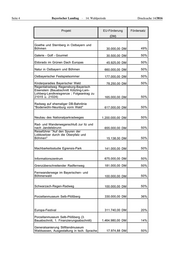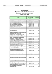Seite 4 Bayerischer Landtag · 14. Wahlperiode Drucksache 14/3816 Projekt EU-Förderung Fördersatz (DM) Goethe und Sternberg in Ostbayern und Böhmen 30.000,00 DM 49% Galerie - Golf - Gourmet 30.500,00 DM 50% Eldorado im Grünen Dach Europas 45.925,00 DM 50% Natur in Ostbayern und Böhmen 660.000,00 DM 50% Ostbayerischer Festspielsommer 177.000,00 DM 50% Kinderparadies Bayerischer Wald 78.250,00 DM 50% Regentalradweg Regensburg-Bayerisch Eisenstein (Bauabschnitt Kötzting-Lam- Lohberg-Landkreisgrenze ; Folgeantrag zu 21015 u. 21024) 165.000,00 DM 50% Radweg auf ehemaliger DB-Bahnlinie "Bodenwöhr-Neunburg vorm Wald" 617.000,00 DM 50% Neubau des Nationalparkradweges 1.200.000,00 DM 50% Rad- und Wanderweganschluß zur Ilz und nach Jandelsbrunn 655.000,00 DM 50% Reiseführer "Auf den Spuren der Lobkowitzer durch die Oberpfalz und Böhmen" 15.138,00 DM 50% Machbarkeitsstudie Egrensis-Park 141.000,00 DM 50% Informationszentrum 675.000,00 DM 50% Grenzüberschreitender Radfernweg 181.000,00 DM 50% Fernwanderwege im Bayerischen- und Böhmerwald 100.000,00 DM 50% Schwarzach-Regen-Radweg 100.000,00 DM 50% Porzellanmuseum Selb-Plößberg 330.000,00 DM 36% Europa-Festival 311.740,00 DM 20% Porzellanmuseum Selb-Plößberg (3. Bauabschnitt, 1. Finanzierungsabschnitt) 1.464.980,00 DM 14% Generalsanierung Stiftlandmuseum Waldsassen, Ausgestaltung in tsch. Sprache 17.974,88 DM 50%