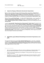 Wissenschaftliche Dienste Sachstand Seite 5 WD 2 - 3000 - 063/17 2. Anspruch auf Zugang zu Dokumenten internationaler Organisationen Einen mit dem deutschen Informationsfreiheitsgesetz (IFG) vergleichbaren Anspruch von Bürgern oder Abgeordneten auf Herausgabe von behördlichen Dokumenten – mit einer korres- pondierenden Rechtfertigungspflicht der Behörde im Falle einer Einstufung des Dokuments – existiert auf völkerrechtlicher Ebene, d.h. im Recht der internationalen Organisationen, nicht. Weltweit hat nur ein Teil der Staaten – vor allem die EU-Mitgliedstaaten – einen Anspruch auf Zugang zu behördlichen Informationen gesetzlich bzw. verfassungsrechtlich geregelt. Von 5 einem völkergewohnheitsrechtlich verfestigten Anspruch auf Informationszugang lässt sich also nicht sprechen. Auch ein internationales „Menschenrecht auf Akteneinsicht“ existiert nicht. Das durch Art. 42 6 der EU-Grundrechtecharta verbürgte Recht auf Zugang zu Dokumenten der Europäischen Union lässt sich auf den internationalen Bereich (insb. auf internationale Organisationen) nicht übertra- gen. Die Rechtsprechung des Europäischen Menschenrechtsgerichtshofes (EGMR) betreffend den Zugang auf behördliche Dokumente zeugt ebenfalls von einem nur auf die EMRK-Staaten be- grenzten Informationsfreiheitsanspruch. Und auch dieser Informationsanspruch wird keinesfalls 7 schrankenlos gewährt, sondern belässt den Staaten die Möglichkeit, diesen Anspruch aus Grün- den der nationalen Sicherheit einzuschränken. 3. Möglichkeiten, gegen ablehnende Entscheidungen internationaler Organisationen vorzu- gehen Internationale Organisationen üben keine deutsche Hoheitsgewalt aus. Auch das vom BVerfG ausdifferenzierte Spannungsfeld zwischen Kernbereichen exekutiver Eigenverantwortlichkeit (insb. zur Geheimhaltung) und demokratischer Transparenz findet sich im Recht der internatio- nalen Organisationen so nicht wieder. 5 Vgl. z.B. entsprechende Regelungen in Österreich, Schweden, Großbritannien, Niederlande, Belgien (Art. 32 belg.-Verf.), Italien, Irland, Frankreich sowie in den USA und Kanada (Freedom of Information Act). 6 Zudem sind internationale Organisationen keine Mitglieder von Menschenrechtsverträgen, gegen die sich ein Anspruch richten könnte. 7 Vgl. EGMR, Urteil vom 10. Juli 2006 – Sdruženi Jihoceské Matky gegen Tschechische Republik, Nr. 19101/03 – betreffend die Anwendung von Art. 10 EMRK auf den Fall einer Verweigerung eines Antrags auf Zugang zu öffentlichen oder behördlichen Dokumenten.