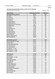 Drucksache 15/4578 Bayerischer Landtag · 15. Wahlperiode Seite 13 Anlage 2 Altersdurchschnitt Altersdurchschnitt der Dienststellen der Dienststellen im Oberpfalz im Bereich der Bereich der Oberpfalz (ohne Direktionen als Dienststelle) (ohne Direktionen als Dienststelle) Stand 28.11.2005 Stand: 28.11.2005 Dienststelle Altersdurchschnitt Beamte PD Regensburg gesamt 44,72 831 PI Cham 43,1 36 PI Kötzting 48,86 30 PI Neumarkt 43,9 73 PI Parsberg 46,15 32 PI Regensburg 1 42,92 93 PI Regensburg 2 41,86 74 PI Regensburg 3 mit E-Zug 40,7 93 PI Regenstauf 46,66 34 PI Roding 47,39 32 PI Wörth/Donau 44,69 28 PI Nittendorf 43,52 33 PI Neutraubling 45,94 41 VPI Regensburg 46,92 76 APS Parsberg 48,15 20 WSP/S Regensburg 48,08 10 KPI Regensburg 46,89 126 PD Weiden gesamt 47,21 342 PI Eschenbach i. d. Opf. 46,74 35 PI Kemnath 47,08 29 PI Neustadt/Waldnaab 47,11 35 PI Tirschenreuth 47,78 34 PI Vohenstrauß 48,26 28 PI Weiden i. d. Opf. 45,36 94 VPI Weiden i. d. Opf. 48,83 41 KPI Weiden i. d. Opf. 49,03 46 PD Amberg 47,12 435 PI Amberg 44,03 98 PI Auerbach i. d. Opf. 47,37 26 Pst Vilseck 52,89 4 PI Burglengenfeld 48,85 34 Pst. Nittenau 46,59 7 PI Nabbrug 49,38 33 PI Neunburg/Wald 46,49 26 PI Oberviechtach 48,06 19 PI Schwandorf 48,58 41 PI Sulzbach-Rosenberg 44,76 33 VPI Amberg 47,92 44 APS Schwandorf 48,95 18 KPI Amberg 48,9 52
