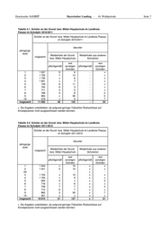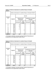 Seite 6 Bayerischer Landtag · 16. Wahlperiode Drucksache 16/13527 Tabelle 1. Zeitliche Entwicklung der Quoten der Übertritte an die Realschule bzw. an das Gymnasium aus Jahrgangsstufe 4 der Grundschule im Landkreis Passau Quote der Übertritte aus Jahrgangsstufe 4 der Grundschule an Schuljahr die Realschule das Gymnasium % % 2007/2008 28,0 29,8 2008/2009 28,3 31,0 2009/2010 26,8 32,6 2010/2011 31,7 29,9 2011/2012 32,7 30,7 Tabelle 2-1. Klassen an staatlichen Realschulen im Landkreis Passau Klassen an staatlichen Realschulen Schuljahr darunter insgesamt mit 26 bis 30 mit 31 oder mehr Schülern Schülern 2010/2011 77 44 13 2011/2012 80 45 6 Tabelle 2-2. Klassen an staatlichen Gymnasien im Landkreis Passau 1 Klassen an staatlichen Gymnasien Schuljahr darunter insgesamt mit 26 bis 30 mit 31 oder mehr Schülern Schülern 2010/2011 72 32 5 2011/2012 69 42 1 1 Ohne Kolleggruppen/Oberstufenkurse.
