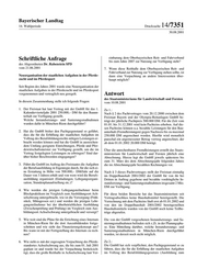 Bayerischer Landtag 14. Wahlperiode Drucksache 14/7351 30.08.2001 Schriftliche Anfrage einbarung dem Oberbayerischen Reit- und Fahrverband bis zum Jahre 2007 zur Nutzung zur Verfügung steht? des Abgeordneten Dr. Rabenstein SPD vom 21.06.2001 7. Wenn diese Reithalle dem Oberbayerischen Reit- und Fahrverband zur Nutzung zur Verfügung stehen sollte, ist Neuorganisation der staatlichen Aufgaben in der Pferde- dann eine Verpachtung an andere Interessenten über- zucht und im Pferdesport haupt möglich? Seit Beginn des Jahres 2001 wurde eine Neuorganisation der staatlichen Aufgaben in der Pferdezucht und im Pferdesport vorgenommen und vertraglich neu geregelt. Antwort des Staatsministeriums für Landwirtschaft und Forsten In diesem Zusammenhang stelle ich folgende Fragen: vom 10.08.2001 1. Der Freistaat hat laut Vertrag mit der GmbH für das 1. Zu 1.: Kalendervierteljahr 2001 250.000,– DM für den Bauun- Nach § 2 des Pachtvertrages vom 20.12.2000 zwischen dem terhalt zur Verfügung gestellt. Freistaat Bayern und der Olympia-Reitanlagen GmbH be- Welche Instandsetzungs- und Sanierungsmaßnahmen trägt der jährliche Pachtpreis 500.000 DM. Für die Zeit vom wurden dafür in München-Riem durchgeführt? 01.01. bis 31.12.2001 wird kein Pachtzins erhoben. Auf die- sen Pachtzins können u.a. bezahlte Leistungen für den Bau- 2. Hat die GmbH bisher den Pachtgegenstand so geführt, unterhalt (Fremdleistungen) gegen Nachweis bis zu maximal dass die für die Erfüllung der staatlichen Aufgaben im 250.000 DM angerechnet werden. Hierfür wird monatlich Vollzug des Berufsbildungsrechts nötigen Leistungen er- pauschal ein angemessener Betrag vorweg angerechnet, der bracht werden können und hat die GmbH in ausreichen- ab dem 01.01.2002 20.000 DM beträgt. dem Umfang geeignete Einrichtungen, Pferde und Pfer- dewirtschaftsmeister zur Verfügung gestellt, um die im Über die anrechenbaren Fremdleistungen erstellt das Staats- Vertrag festgelegten Leistungen zu erbringen? Sind dar- ministerium für Landwirtschaft und Forsten jährlich eine über bisher Beschwerden eingegangen? Abrechnung. Hierzu legt die GmbH jeweils spätestens bis zum 31. März des dem Abrechnungsjahr folgenden Jahres 3. Führt die GmbH im Auftrag des Freistaates die Aufgaben die im Abrechnungsjahr bezahlten Rechnungen vor. der Berufsausbildung in Eigenregie durch, für die sich ei- ne Erstattung in Höhe von 500.000,– DM/Jahr auf die Nach § 3 dieses Pachtvertrages stellt der Freistaat einmalig Dauer von 3 Jahren erhält und von wem wird die Berufs- im Doppelhaushalt 2001/2002 der GmbH für von ihr bei ausbildung organisiert (Einladungen, Lehrgangsorgani- Dritten in Auftrag gegebene und bezahlte vordringliche In- sation, Stundenplanaufstellung etc.)? standsetzungs- und Sanierungsmaßnahmen insgesamt 2 Mio. DM zur Verfügung. 4. Wie werden die jetzigen Lehrgangsteilnehmer beim Blockpraktikum im Vergleich zum Ausbildungsort Ach- Für diese beiden Bereiche hat das Staatsministerium seit selschwang untergebracht, wie ist die Versorgung (Früh- Vertragsabschluss keine Haushaltsmittel bereitgestellt. Die stück, Mittagessen ect.) und werden die jetzigen Lehr- Verrechnung mit dem Pachtzins läuft erst ab 01.01.2002 und gangsteilnehmer bei der überbetrieblichen Ausbildung von den im Doppelhaushalt 2001/2002 bereitgestellten (Zwischenprüfung und Prüfung) im Vergleich zum Aus- Haushaltsmitteln wurden von der GmbH noch keine Teilbe- bildungsort Achselschwang untergebracht und versorgt? träge abgerufen. 5. Wie weit sind die Pläne für die Errichtung eines Internats Die von der GmbH vorgesehenen Instandsetzungs- und Sa- in München-Riem für die dort Auszubildenden fortge- nierungsmaßnahmen befinden sich z.Zt. in der Planungspha- schritten und wie sieht das Finanzierungskonzept aus? se. Eine Mitteilung darüber, welche Instandsetzungs- und Bis wann ist mit der Fertigstellung des Internats zu rech- Sanierungsmaßnahmen in München-Riem durchgeführt nen? wurden, ist derzeit noch nicht möglich. 6. Wie sieht es mit der zugesagten Verpachtung des Pferde- Zu 2.: standortes Achselschwang aus, die bis zum 01. Juli 2001 Die GmbH hat sich verpflichtet, den Pachtgegenstand so zu geplant ist und wurde bei der Verpachtung berücksich- führen, dass die für die Erfüllung der staatlichen Aufgaben tigt, dass die große Reithalle in Achselschwang laut Ver- im Vollzug des Berufsbildungsgesetzes (Ausbildung zum
