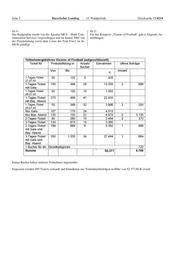 Seite 2 Bayerischer Landtag · 15. Wahlperiode Drucksache 15/4214 Zu 4.: Zu 5.: Der Budgetplan wurde von der Agentur MCS – Multi Com- Für den Kongress „Visions of Football“ gab es folgende An- munication Services vorgeschlagen und im Januar 2005 von meldungen: der Projektleitung sowie dem Leiter der Task Force im St- MUK gebilligt. Teilnehmergebühren Visions of Football (aufgeschlüsselt) Ticket für Preisstaffelung in Anzahl Einnahmen offene Beträge Bucher Von Bis Anzahl € 1-Tages-Ticket 50 125 5 325 27.07.05 1-Tages-Ticket 150 499 28 12.350 2 698 mit Gala 1-Tages-Ticket 50 150 15 1.050 28.07.05 1-Tages-Ticket 275 499 47 22.430 mit Bay. Abend 1-Tages-Ticket 50 399 32 3.996 2 200 29.07.05 Nur Gala 157 175 24 4.515 Nur Bay. Abend 135 150 31 8.970 2 3.135 2-Tages-Ticket 90 280 15 2.494 2 370 3-Tages-Ticket 130 875 10 3.360 2-Tages-Ticket 799 999 6 5.392 1 999 mit Gala und Bay. Abend 3-Tages-Ticket 350 1.250 34 27.494 1 664 mit Gala und Bay. Abend 1 Bucher für div. Einzelkategorien 720 Summe !Syntaxfehler, 92.377 6.786 ) Einige Bucher haben mehrere Teilnehmer angemeldet. Insgesamt wurden 280 Tickets verkauft und Einnahmen aus Teilnehmerbeiträgen in Höhe von 92.377,00 € erzielt.