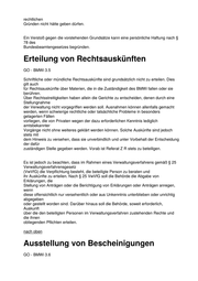 rechtlichen Gründen nicht hätte geben dürfen. Ein Verstoß gegen die vorstehenden Grundsätze kann eine persönliche Haftung nach § 78 des Bundesbeamtengesetzes begründen. Erteilung von Rechtsauskünften GO - BMWi 3.5 Schriftliche oder mündliche Rechtsauskünfte sind grundsätzlich nicht zu erteilen. Dies gilt auch für Rechtsauskünfte über Materien, die in die Zuständigkeit des BMWi fallen oder sie berühren. Über Rechtsstreitigkeiten haben allein die Gerichte zu entscheiden, denen durch eine Stellungnahme der Verwaltung nicht vorgegriffen werden soll. Ausnahmen können allenfalls gemacht werden, wenn schwierige rechtliche oder tatsächliche Probleme in besonders gelagerten Fällen vorliegen, die von Privaten wegen der dazu erforderlichen Kenntnis lediglich amtsbekannter Vorgänge nicht ohne weiteres geklärt werden können. Solche Auskünfte sind jedoch stets mit dem Hinweis zu versehen, dass sie unverbindlich und unter Vorbehalt der Entscheidung der dafür zuständigen Stelle gegeben werden. Vorab ist Referat Z R stets zu beteiligen. Es ist jedoch zu beachten, dass im Rahmen eines Verwaltungsverfahrens gemäß § 25 Verwaltungsverfahrensgesetz (VwVfG) die Verpflichtung besteht, die beteiligte Person zu beraten und ihr Auskünfte zu erteilen. Nach § 25 VwVfG soll die Behörde die Abgabe von Erklärungen, die Stellung von Anträgen oder die Berichtigung von Erklärungen oder Anträgen anregen, wenn diese offensichtlich nur versehentlich oder aus Unkenntnis unterblieben oder unrichtig abgegeben oder gestellt worden sind. Darüber hinaus soll die Behörde, soweit erforderlich, Auskunft über die den beteiligten Personen im Verwaltungsverfahren zustehenden Rechte und die ihnen obliegenden Pflichten erteilen. nach oben Ausstellung von Bescheinigungen GO - BMWi 3.6