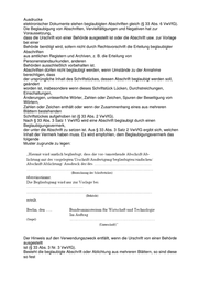 Ausdrucke elektronischer Dokumente stehen beglaubigten Abschriften gleich (§ 33 Abs. 6 VwVfG). Die Beglaubigung von Abschriften, Vervielfältigungen und Negativen hat zur Voraussetzung, dass die Urschrift von einer Behörde ausgestellt ist oder die Abschrift usw. zur Vorlage bei einer Behörde benötigt wird, sofern nicht durch Rechtsvorschrift die Erteilung beglaubigter Abschriften aus amtlichen Registern und Archiven, z. B. die Erteilung von Personenstandsurkunden, anderen Behörden ausschließlich vorbehalten ist. Abschriften dürfen nicht beglaubigt werden, wenn Umstände zu der Annahme berechtigen, dass der ursprüngliche Inhalt des Schriftstückes, dessen Abschrift beglaubigt werden soll, geändert worden ist, insbesondere wenn dieses Schriftstück Lücken, Durchstreichungen, Einschaltungen, Änderungen, unleserliche Wörter, Zahlen oder Zeichen, Spuren der Beseitigung von Wörtern, Zahlen oder Zeichen enthält oder wenn der Zusammenhang eines aus mehreren Blättern bestehenden Schriftstückes aufgehoben ist (§ 33 Abs. 2 VwVfG). Nach § 33 Abs. 3 Satz 1 VwVfG wird eine Abschrift beglaubigt durch einen Beglaubigungsvermerk, der unter die Abschrift zu setzen ist. Aus § 33 Abs. 3 Satz 2 VwVfG ergibt sich, welchen Inhalt der Vermerk haben muss. Es wird empfohlen, dem Beglaubigungsvermerk das folgende Muster zugrunde zu legen: Der Hinweis auf den Verwendungszweck entfällt, wenn die Urschrift von einer Behörde ausgestellt ist (§ 33 Abs. 3 Nr. 3 VwVfG). Besteht die beglaubigte Abschrift oder Ablichtung aus mehreren Blättern, so sind diese so fest