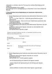 miteinander zu verbinden, dass ihre Trennung ohne merkbare Beschädigung nicht möglich ist; die Verbindungsstellen sind zu siegeln. § 33 VwVfG gilt nicht für die Beglaubigung von Abschriften für den internen Bedarf der Behörde. 2. Besonderheiten bei der Beglaubigung von Ausdrucken elektronischer Dokumente • • • Bei der Beglaubigung des Ausdrucks eines elektronischen Dokuments ist nach § 33 Abs. 4 Nr. 3 i. V. m. Abs. 3 Satz 2 Nr. 1 VwVfG die genaue Bezeichnung des elektronischen Dokuments anzugeben . Hierzu ist ein kurzer Inhaltshinweis ausreichend, etwa „Ausfuhrgenehmigung des Bundesausfuhramtes – Az V 55555-6“. Für die Beglaubigung des Ausdrucks eines elektronischen Dokuments, das nicht mit einer qualifizierten elektronischen Signatur verbunden ist, wird empfohlen, dem Beglaubigungsvermerk das folgende Muster zugrunde zu legen: Bei der Beglaubigung eines Ausdrucks eines elektronischen Dokuments, das mit einer qualifizierten elektronischen Signatur verbunden ist, muss der Beglaubigungsvermerk nach § 33 Abs. 5 Nr. 1 VwVfG zusätzlich angeben: - wen die Signaturprüfung als Inhaber(in) der Signatur ausweist, - welchen Zeitpunkt die Signaturprüfung für die Anbringung der Signatur ausweist und - welche Zertifikate mit welchen Daten dieser Signatur zugrunde lagen.