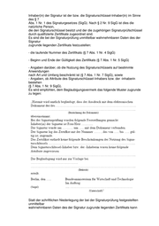Inhaber(in) der Signatur ist der bzw. die Signaturschlüssel-Inhaber(in) im Sinne des § 7 Abs. 1 Nr. 1 des Signaturgesetzes (SigG). Nach § 2 Nr. 9 SigG ist dies die natürliche Person, die den Signaturschlüssel besitzt und der die zugehörigen Signaturprüfschlüssel durch qualifizierte Zertifikate zugeordnet sind. Es sind die bei der Signaturprüfung unmittelbar wahrnehmbaren Daten des der Signatur zugrunde liegenden Zertifikats festzustellen: - die laufende Nummer des Zertifikats (§ 7 Abs. 1 Nr. 4 SigG) - Beginn und Ende der Gültigkeit des Zertifikats (§ 7 Abs. 1 Nr. 5 SigG) - Angaben darüber, ob die Nutzung des Signaturschlüssels auf bestimmte Anwendungen nach Art und Umfang beschränkt ist (§ 7 Abs. 1 Nr. 7 SigG), sowie - Angaben, ob Attribute des Signaturschlüssel-Inhabers bzw. der -inhaberin bestehen (§ 7 Abs. 1 Nr. 9 SigG). Es wird empfohlen, dem Beglaubigungsvermerk das folgende Muster zugrunde zu legen: Statt der schriftlichen Niederlegung der bei der Signaturprüfung festgestellten unmittelbar wahrnehmbaren Daten des der Signatur zugrunde liegenden Zertifikats kann