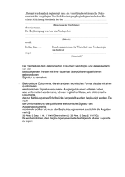 Der Vermerk ist dem elektronischen Dokument beizufügen und dieses sodann von der beglaubigenden Person mit ihrer dauerhaft überprüfbaren qualifizierten elektronischen Signatur zu versehen. • Elektronische Dokumente, die ein anderes technisches Format als das mit einer qualifizierten elektronischen Signatur verbundene Ausgangsdokument erhalten haben, also umformatiert worden sind, können in gleicher Weise, wie elektronische Dokumente, die zur Abbildung eines Schriftstücks hergestellt wurden, beglaubigt werden. Da nach der Umformatierung die qualifizierte elektronische Signatur des Ausgangsdokuments nicht mehr prüfbar ist, muss der Beglaubigungsvermerk zusätzlich die Angaben nach § 33 Abs. 5 Satz 1 Nr. 1 VwVfG enthalten (§ 33 Abs. 5 Satz 2 VwVfG). Es wird empfohlen, dem Beglaubigungsvermerk das folgende Muster zugrunde zu legen:
