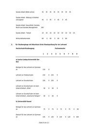 Soziale Arbeit (BASA online) 35 35 35 35 35 35 35 35 Soziale Arbeit - Bildung in Kindheit und Jugend 45 0 45 0 45 0 45 Soziale Arbeit: Gesundheit, Soziales Recht und Soziales Management 100 Soziale Arbeit - Teilzeit 10 10 10 10 10 10 10 10 10 Wirtschaftsinformatik 60 0 60 0 60 0 60 2. für Studiengänge mit Abschluss Erste Staatsprüfung für ein Lehramt Hochschule/Studiengang Fachsemester 1 2 3 4 5 6 7 8 9 a) Justus-Liebig-Universität Gie- ßen Biologie für das Lehramt an Gymnasi- en 110 0 Lehramt an Förderschulen 210 0 210 0 Lehramt an Grundschulen 220 0 220 0 Lehramt an Grundschulen mit dem Unterrichtsfach „Ethik“ 30 0 30 0 Lehramt an Grundschulen mit dem Unterrichtsfach „Islamische Religion“ 30 0 30 0 b) Universität Kassel Biologie für das Lehramt an Gymnasi- en 75 0 75 0 75 0 75 0 65 Deutsch für das Lehramt an Gymnasi- en 145 0 130 0 130 0 120 0 100 - Seite 8 von 12 -