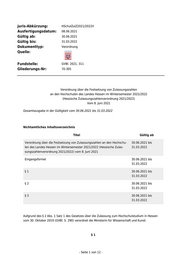 juris-Abkürzung: HSchulZulZ2021/2022V Ausfertigungsdatum: 08.06.2021 Gültig ab: 30.06.2021 Gültig bis: 31.03.2022 Dokumenttyp: Verordnung Quelle: Fundstelle: GVBl. 2021, 311 Gliederungs-Nr: 70-305 Verordnung über die Festsetzung von Zulassungszahlen an den Hochschulen des Landes Hessen im Wintersemester 2021/2022 (Hessische Zulassungszahlenverordnung 2021/2022) Vom 8. Juni 2021 Gesamtausgabe in der Gültigkeit vom 30.06.2021 bis 31.03.2022 Nichtamtliches Inhaltsverzeichnis Titel Gültig ab Verordnung über die Festsetzung von Zulassungszahlen an den Hochschu- 30.06.2021 bis len des Landes Hessen im Wintersemester 2021/2022 (Hessische Zulas- 31.03.2022 sungszahlenverordnung 2021/2022) vom 8. Juni 2021 Eingangsformel 30.06.2021 bis 31.03.2022 §1 30.06.2021 bis 31.03.2022 §2 30.06.2021 bis 31.03.2022 §3 30.06.2021 bis 31.03.2022 Aufgrund des § 2 Abs. 1 Satz 1 des Gesetzes über die Zulassung zum Hochschulstudium in Hessen vom 30. Oktober 2019 (GVBl. S. 290) verordnet die Ministerin für Wissenschaft und Kunst: §1 - Seite 1 von 12 -