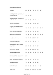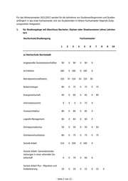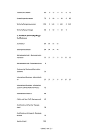 Technische Chemie 60 0 75 0 75 0 75 Umweltingenieurwesen 70 0 80 0 80 0 80 Wirtschaftsingenieurwesen 150 0 140 0 140 0 140 Wirtschaftspsychologie 60 0 60 0 60 0 b) Frankfurt University of App- lied Sciences Architektur 84 84 84 84 Bauingenieurwesen 94 94 94 94 Betriebswirtschaft - Business Admi- nistration 77 77 77 77 77 77 77 Betriebswirtschaft Doppelabschluss 8 Engineering Business Information Systems 35 International Business Administrati- on 37 37 37 37 37 37 37 International Business Information Systems (Wirtschaftsinformatik) 73 International Finance 44 Public und Non-Profit Management 42 Real Estate und Facility Manage- ment 38 Real Estate und Integrale Gebäude- technik 19 Soziale Arbeit 310 - Seite 3 von 12 -