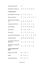 Soziale Arbeit transnational 18 Wirtschaftsrecht - Business Law 83 83 83 83 83 83 83 c) Hochschule Fulda Berufspädagogik Fach Gesundheit 50 0 50 0 50 0 Hebammenkunde (dual) 50 0 50 0 50 0 50 0 International Business & Manage- ment 40 40 40 40 40 40 International Health Sciences 60 0 60 0 60 0 60 Internationale BWL 90 90 90 90 90 90 90 Oecotrophologie 128 0 100 0 100 0 Physiotherapie 45 0 45 0 45 0 45 Soziale Arbeit (Onlinestudiengang) 0 60 0 60 0 60 0 60 Soziale Arbeit (Präsenz) 120 120 120 120 120 120 120 Soziale Sicherung, Inklusion, Ver- waltung (dual) 30 0 30 0 30 0 30 Wirtschaftsrecht - Nachhaltigkeit und Ethik 45 0 45 0 45 0 45 d) Justus-Liebig-Universität Gießen Bewegung und Gesundheit 130 0 140 0 Biologie 175 0 170 0 Ernährungswissenschaften 115 0 115 0 - Seite 4 von 12 -