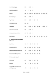 Kindheitspädagogik 135 0 135 0 Lebensmittelchemie 35 0 33 0 Medizin 180 175 175 175 160 155 155 155 155 155 Ökotrophologie 180 0 180 0 Psychologie 150 0 150 0 150 0 Rechtswissenschaft 400 100 Tiermedizin 210 0 190 0 180 0 180 0 180 0 Umweltmanagement 120 0 120 0 Wirtschaftswissenschaften 440 30 450 0 Zahnmedizin 34 32 29 29 29 29 29 29 29 29 e) Technische Hochschule Mit- telhessen Architektur 60 40 60 40 60 40 Betriebswirtschaft 190 130 160 95 160 90 190 Eventmanagement und -technik 93 0 100 0 103 0 80 Medizinisches Management 90 90 90 90 90 90 90 f) Universität Kassel Architektur 115 0 115 0 115 0 Biologie 70 0 70 0 70 0 Landschaftsarchitektur/Land- schaftsplanung 75 0 70 0 70 0 - Seite 5 von 12 -
