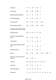 Psychologie 95 0 90 0 80 0 Soziale Arbeit 330 0 330 0 330 0 Stadtplanung/Regionalplanung 50 0 55 0 55 0 Wirtschaftspädagogik 115 0 115 0 110 0 Wirtschaftsrecht 120 0 120 0 120 0 151 Wirtschaftswissenschaften 360 0 350 0 390 0 360 g) Philipps-Universität Marburg Betriebswirtschaft 120 45 95 35 75 30 Erziehungs- und Bildungswissen- schaft 170 0 145 0 125 0 Humanbiologie 70 0 52 0 45 0 Interkulturelle Betriebswirtschafts- lehre 40 0 35 0 30 0 Medienwissenschaft 66 0 53 0 50 0 Medizin 302 0 291 0 291 0 287 0 287 0 Medizin (nur vorklinischer Studien- abschnitt) 149 0 129 0 Pharmazie 140 85 120 75 115 75 110 70 Psychologie 145 0 125 0 65 0 Volkswirtschaftslehre 40 25 30 15 20 10 Zahnmedizin 37 34 33 32 32 31 31 30 30 30 - Seite 6 von 12 -
