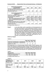 BÜRGERSCHAFT DER FREIEN UND HANSESTADT HAMBURG Drucksache 22/1203 22. Wahlperiode 04.09.20 Schriftliche Kleine Anfrage der Abgeordneten Richard Seelmaecker, Silke Seif und Dennis Gladiator (CDU) vom 27.08.20 und Antwort des Senats Betr.: Entwicklung der Verurteilungen von Hamburgs Jugendlichen und Her anwachsenden Einleitung für die Fragen: Erfreulicherweise sinkt – wie fast überall bundesweit – nicht nur die Kriminalität allgemein, sondern auch die Jugendkriminalität. Dennoch waren in Hamburg nach Angaben des Senats in der Drs. 22/879 zum 31. Juli 2020 430 Intensiv täter ausgeschrieben, unter denen sich 275 Jugendliche und Heranwach sende und zwei Kinder befanden. Mithin gibt es nach wie vor eine relativ kleine Gruppe von Jugendlichen und Heranwachsenden in Hamburg, die für über proportional viele Straftaten verantwortlich ist. Dieser muss mit besonderer Entschlossenheit begegnet werden. Anders als beispielsweise in Nordrhein-Westfalen hat der Senat in Hamburg bedauerlicherweise keine Kenntnis über die Anzahl der Mehrfachtäter, also Täter, die innerhalb eines Jahres mindestens fünfmal als Tatverdächtige einer Straftat polizeilich erfasst sind. Diese separate Erfassung hält der Senat für nicht erforderlich, wie er in den Drs. 21/13453 und 22/879 angibt. Es stellt sich die Frage, wie sich Art und Anzahl der Verurteilungen von Jugendlichen und Heranwachsenden in Hamburg entwickelt haben. Wir fragen den Senat: Frage 1: Wie hat sich die Anzahl der Tatverdächtigen unter 21 Jahren nach der PKS seit dem Jahre 2016 entwickelt? Bitte in absoluten und pro zentualen Zahlen angeben. Antwort zu Frage 1: Die Aussagekraft der Polizeilichen Kriminalstatistik (PKS) ist auf Jahresauswertungen ausgelegt. Innerhalb eines Berichtsjahres unterliegt der PKS-Datenbestand einer stän digen Pflege, zum Beispiel durch Hinzufügen von nachträglich ermittelten Tatverdäch tigen (TV) oder der Herausnahme von Taten, die sich im Nachhinein nicht als Straftat erwiesen haben. In der PKS wird ein Fall in dem Monat gezählt, in dem er erfasst wurde. Die Tatzeit bleibt dabei unberücksichtigt. Wird ein Datensatz in einem Folgemonat im Sinne der ständigen Pflege geändert, wird der Fall zukünftig dem Monat der Aktualisie rung zugeordnet. Im Übrigen zu den Kriterien für eine PKS-Erfassung siehe Drs. 21/16332. Tabelle 1 Tatverdächtige Anteil TVu21 an der Jahr insge TVu21 Gesamtzahl in Prozent samt 2016 74.888 16.097 21,5 %