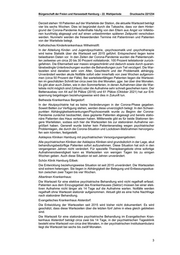 Drucksache 22/1234 Bürgerschaft der Freien und Hansestadt Hamburg – 22. Wahlperiode Universitätsklinikum Hamburg-Eppendorf: Das UKE führt keine Statistik über die nachgefragten Wartezeiten, eine Beantwortung ist daher lediglich zur aktuellen Situation möglich – und auch dies lediglich als grobe Ad-hoc-Schätzung der Stationen der Klinik und Poliklinik für Psychiatrie und Psycho therapie sowie der Klinik und Poliklinik für Kinder- und Jugendpsychiatrie, -psychothe rapie und -psychosomatik des UKE. Zudem differieren die Wartezeiten auch in Abhän gigkeit von den jeweiligen Störungsbildern. Die Wartezeiten auf eine elektive stationäre Behandlung in der Klinik und Poliklinik für Psychiatrie und Psychotherapie liegen derzeit zwischen circa ein bis zwei Wochen bis zu circa acht bis 16 Wochen. Stationäre Aufnahmen von Patienten mit akuten Aufnah meindikationen können in Abhängigkeit von der Dringlichkeit dagegen kurzfristig reali siert werden. Die Wartezeiten auf eine elektive stationäre Behandlung in der Klinik und Poliklinik für Kinder- und Jugendpsychiatrie, -psychotherapie und -psychosomatik lie gen derzeit zwischen circa zwei bis vier Monaten bei Adoleszenten und bis zu sechs Monaten bei Kindern und Jugendlichen. Die Akutversorgung von Notfällen kann sehr kurzfristig erfolgen. Patienten mit schweren Störungen, die aber nicht mehr akutversor gungspflichtig sind, können während der Wartezeit im Rahmen der (begrenzten) Kapa zitäten überbrückend ambulante Betreuung erhalten. Sowohl in der Erwachsenenpsychiatrie als auch in besonderem Maße in der Kinder- und Jugendpsychiatrie ist im Vergleich zu 2015 nach Einschätzung der Kliniken eine vermehrte Inanspruchnahme sowie eine Verlängerung der Wartezeit zu beobachten. Frage 8: Welche Maßnahmen hat der Senat während des Lockdowns ergrif fen, um eine Ausweitung der psychischen Erkrankung in der Bevöl kerung einzudämmen? Antwort zu Frage 8: Es gab in den Wochen des Lockdowns und danach vielfältige Angebote zur psychoso zialen Gesundheit in Zeiten des Coronavirus. Siehe unter anderem https://www.ham burg.de/coronavirus/gesundheit/13810720/seelische-gesundheit/. Frage 9: Wie hoch war die Auslastung der Hamburger Krankenhäuser mit psy chiatrischen Behandlungszentren während des Lockdowns? Bitte jeweils quartalsweise angeben für die Jahre 2015 bis heute. Antwort zu Frage 9: Die Entwicklung der Auslastung ist differenziert nach den psychiatrischen Fachgebieten der Plankrankenhäuser der folgenden Tabelle zu entnehmen. Tabelle 3 Auslastung der Planbetten der psychiatrischen Fachgebiete der Hamburger Plankrankenhäuser in Prozent (Jahre 2015 bis 2020 nach Quartalen): Psychosomatische Kinder- und Jugend- Psychiatrie und 1) 2) Medizin und psychiatrie Psychotherapie 3) Psychotherapie 1. Quartal 2015 100,0 100,8 102,3 2. Quartal 2015 104,0 99,9 100,4 3. Quartal 2015 100,3 96,7 104,5 4. Quartal 2015 97,3 97,0 99,5 1. Quartal 2016 77,3 98,8 100,6 2. Quartal 2016 81,9 98,3 100,6 3. Quartal 2016 81,0 95,8 99,5 4. Quartal 2016 80,5 93,6 99,5 1. Quartal 2017 81,6 97,4 99,3 2. Quartal 2017 80,2 96,1 96,9 3. Quartal 2017 79,8 94,9 94,7 4. Quartal 2017 80,2 93,4 91,8 1. Quartal 2018 80,8 92,9 91,2 2. Quartal 2018 81,4 92,5 92,7 4