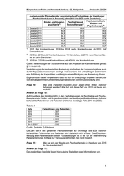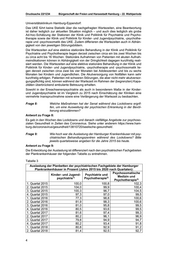 Bürgerschaft der Freien und Hansestadt Hamburg – 22. Wahlperiode Drucksache 22/1234 Auslastung der Planbetten der psychiatrischen Fachgebiete der Hamburger Plankrankenhäuser in Prozent (Jahre 2015 bis 2020 nach Quartalen): Psychosomatische Kinder- und Jugend- Psychiatrie und 1) 2) Medizin und psychiatrie Psychotherapie 3) Psychotherapie 3. Quartal 2018 81,8 89,6 95,1 4. Quartal 2018 80,8 89,6 88,6 1. Quartal 2019 84,9 91,2 84,6 2. Quartal 2019 84,3 93,5 99,2 3. Quartal 2019 84,6 93,2 97,4 4. Quartal 2019 83,5 90,3 97,2 1. Quartal 2020 82,6 89,1 92,2 2. Quartal 2020 66,7 68,5 53,7 1) 2015: fünf Krankenhäuser, 2016 bis 2018: sechs Krankenhäuser, ab 2019: fünf Krankenhäuser 2) 2015 bis 2018: zwölf Krankenhäuser an 13 Standorten, ab 2019: neun Krankenhäu ser an zehn Standorten 3) 2015 bis 3/2019: zwei Krankenhäuser, ab 4/2019: vier Krankenhäuser Quelle: Berechnungen der Sozialbehörde aus den Angaben der Krankenhäuser gemäß § 15 HmbKHG. Veränderungen der rechnerischen Auslastung sind neben der Inanspruchnahme auch durch Kapazitätsanpassungen bedingt. Insbesondere bei unterjährigen Daten kann eine Erhöhung der Kapazitäten kurzfristig zu einem Rückgang der Auslastung führen. Ergänzend sei darauf hingewiesen, dass es sich um unterjährige Angaben handelt, die von den abgestimmten Jahresmeldungen abweichen können und vorläufig sind. Frage 10: Wie viele Patienten mussten 2020 gegen ihren Willen stationär behandelt werden? Wie hat sich diese Zahl von 2015 bis heute ent wickelt? Antwort zu Frage 10: Auf Grundlage des HmbPsychKG in den Fachabteilungen für Psychiatrie und Psycho therapie sowie Kinder- und Jugendpsychiatrie der Hamburger Krankenhäuser stationär behandelte Patientinnen und Patienten (richterlich bestätigte Fälle 2015 bis 2020): Tabelle 4 Jahr Patientinnen und Patienten 2015 1.797 2016 1.903 2017 1.779 2018 2.393 2019 1.997 Bis 8.2020* 1.352 Quelle: Zentraler Zuführdienst Die Zahl der in den genannten Fachabteilungen auf Grundlage des BGB stationär behandelten Patientinnen und Patienten wird statistisch nicht erfasst. Eine Einzelaus wertung aller Patientenakten dieser Fachabteilungen ist in der für die Beantwortung Parlamentarischer Anfrage zur Verfügung stehenden Zeit nicht möglich. Frage 11: Wie hat sich der Absatz von Psychopharmaka in Hamburg von 2015 bis heute entwickelt? Antwort zu Frage 11: Der zuständigen Behörde liegen hierzu keine Statistiken oder Informationen vor. 5