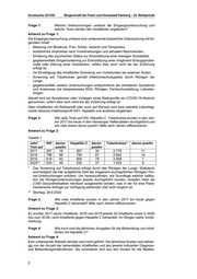 Drucksache 22/1535 Bürgerschaft der Freien und Hansestadt Hamburg – 22. Wahlperiode Frage 1: Welche Untersuchungen umfasst die Eingangsuntersuchung und welche Tests werden den Inhaftierten angeboten? Antwort zu Frage 1: Die Eingangsuntersuchung umfasst eine umfassende körperliche Untersuchung mit fol gendem Inhalt: - Messung von Blutdruck, Puls, Größe, Gewicht und Temperatur, - ausführliche Anamnese nach Vorerkrankungen und aktuellen Beschwerden, - Erhebung des psychischen Status zur Einschätzung einer etwaigen Suizidalität, - gegebenenfalls Drogenscreening zur Einschätzung einer möglichen Entzugsproble matik oder Klärung einer Substitution, sofern dies noch nicht bei der Zuführung erfolgt ist, - mit Einwilligung des Inhaftierten Einholung von Vorbefunden bei externen Ärzten, - Screening auf Tuberkulose gemäß Infektionsschutzgesetz durch Röntgen der Lunge, - gegebenenfalls weitere Untersuchungen entsprechend der erhobenen Symptome und Anamnese wie beispielsweise EKG, Röntgen, Facharztvorstellung, Labortes tungen. Aktuell wird bei Symptomen oder Vorliegen eines Risikoprofils ein COVID-19-Abstrich genommen, sofern dies noch nicht bei der Zuführung erfolgt ist. Allen Inhaftierten mit Risikoprofil oder auch auf Wunsch wird eine zeitnahe Labordiag nostik inklusive Infektionsprofil (HIV, Hepatitis und anderes) angeboten. Frage 2: Wie viele Tests auf HIV, Hepatitis C, Tuberkulose wurden in den Jah ren 2017 bis heute in den Hamburger Haftanstalten durchgeführt und wie viele waren davon positiv? Bitte nach Jahren differenzieren. Antwort zu Frage 2: Tabelle 1 Jahr/ HIV davon Hepatitis C davon Tuberkulose* davon positiv Test auf positiv positiv 2017 267 16 267 30 2.775 11 2018 798 66 784 87 2.642 14 2019 818 62 805 79 2.558 7 2020** 530 49 530 37 1.429 9 * Das Screening auf Tuberkulose erfolgt durch das Röntgen der Lunge. Statistisch wird lediglich die hier aufgeführte Zahl der insgesamt durchgeführten Röntgen-Tho rax-Untersuchungen erhoben. Um herauszufinden, auf Grundlage welcher Indika tion die Röntgenuntersuchungen jeweils durchgeführt wurden, müssten mehr als 2.000 Gesundheitsakten händisch ausgewertet werden, was in der für eine Parla mentarische Anfrage zur Verfügung stehenden Zeit nicht möglich ist. ** Stichtag: 29.9.2020 Frage 3: Wie viele Inhaftierte wurden in den Jahren 2017 bis heute gegen Hepatitis C behandelt? Bitte nach Jahren differenzieren. Antwort zu Frage 3: Es wurden 2017 sechs Inhaftierte, 2018 und 2019 jeweils 20 Inhaftierte sowie in 2020 (bis zum 30.06.) acht Inhaftierte gegen Hepatitis C behandelt. Im Übrigen siehe Vorbe merkung. Frage 4: Wie hoch sind die jährlichen Ausgaben für die Behandlung von Inhaf tierten mit Hepatitis C? Antwort zu Frage 4: Eine umfassende Statistik darüber wird nicht geführt. Die jährlichen Kosten sind abhän gig von der Anzahl der behandelten Inhaftierten und den jeweils indizierten Diagnose- und Behandlungsmaßnahmen. Sie summieren sich aus den Kosten für die Medika 2