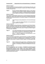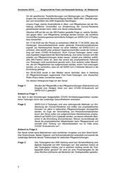Drucksache 22/218 Bürgerschaft der Freien und Hansestadt Hamburg – 22. Wahlperiode Antwort zu Frage 8: Die Gesundheitsämter überwachen die Situation in den Einrichtungen sehr genau, sind in einem engen Austausch mit den Betreibern und gehen allen Hinweisen auf mögliche Verstöße konsequent nach. Frage 9: Wie viele stationäre Pflegeeinrichtungen wurden von den Gesund heitsämtern auf die Einhaltung rechtlicher Regelungen beziehungs weise behördlicher Vorgaben zur Pandemie-Eindämmung überprüft? Um eine Angabe für den Zeitraum 01.04.2020 bis heute wird gebeten. Antwort zu Frage 9: Nach Angaben der Bezirksämter wurden bei 92 von 150 Einrichtungen Überprüfungen vorgenommen. Hierbei wurden insbesondere die Konzepte und Maßnahmenplanungen bezüglich der Einhaltung behördlicher und rechtlicher Vorgaben zur Pandemieeindäm mung überprüft. Frage 10: Finden Prüfungen der Gesundheitsämter vor Ort in den Einrichtungen statt? Wenn ja – wurden die prüfenden Mitarbeiter der Gesundheitsämter zuvor auf SARS-CoV-2 getestet? Antwort zu Frage 10: Es finden Prüfungen des Gesundheitsamtes in Einrichtungen statt. Prüfende Mitarbei terinnen und Mitarbeiter werden zuvor nicht auf SARS-CoV-2 getestet, da sie nur ein gesetzt werden, wenn sie symptomfrei sind. Ein Kontakt zu den Bewohnerinnen und Bewohnern ist nicht gegeben. Bei der Arbeit werden im Übrigen die üblichen Hygiene- und Distanzregeln eingehalten. Frage 11: In wie vielen Einrichtungen wurde das Interventionsteam bisher (Zeit raum seit dem 01.04.2020) zur Unterstützung der Betreiber einge setzt? Findet der Einsatz vor Ort in den Einrichtungen statt? Wenn ja – wurden die Mitglieder des Interventionsteams vor den Einsätzen auf SARS-CoV-2 getestet? Antwort zu Frage 11: Das Interventionsteam wurde bislang in zwei Einrichtungen vor Ort tätig. Die Mitglieder werden zuvor nicht auf SARS-CoV-2 getestet, da sie nur eingesetzt werden, wenn sie symptomfrei sind. Ein Kontakt zu den Bewohnerinnen und Bewohnern ist nicht gege ben. Bei der Arbeit werden im Übrigen die üblichen Hygiene- und Distanzregeln einge halten. Frage 12: Welche Sanktionen können gegen Alten- und Pflegeheime verhängt werden, die behördliche Auflagen beziehungsweise gesetzliche Vor schriften zur Vermeidung von SARS-CoV-2-Infektionen nicht einhal ten? Antwort zu Frage 12: Bei Ordnungswidrigkeiten nach § 33 Absatz 1 HmbSARS-CoV-2-EindämmungsVO kann eine Geldbuße nach den in der Anlage zur Verordnung bestimmten Beträgen (Bußgeldkatalog) festgesetzt werden. Darüber hinaus können Bußgelder auf der Grundlage des Hamburgischen Wohn- und Betreuungsqualitätsgesetzes (HmbWBG) verhängt und Maßnahmen nach §§ 33 – 35 angeordnet werden, die bis zu Schließung einer Einrichtung reichen können. 4