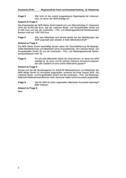 Drucksache 22/163 Bürgerschaft der Freien und Hansestadt Hamburg – 22. Wahlperiode Frage 3: Wie hoch ist das zuletzt ausgewiesene Eigenkapital der Unterneh men, an denen der NDR beteiligt ist? Antwort zu Frage 3: Das Eigenkapital der NDR Media GmbH beläuft sich zum Bilanzstichtag 31. Dezember 2018 auf 34.452.000 Euro, das der Lübecker Musik- und Kongreßhallen GmbH auf 51.000 Euro und das der nordmedia – Film- und Mediengesellschaft Niedersachsen/ Bremen mbH auf 1.067.000 Euro. Frage 4: Wie viele Mitarbeiter sind derzeit jeweils bei den Beteiligungen des NDR angestellt oder arbeiten in freier Mitarbeiterschaft? Antwort zu Frage 4: Die NDR Media GmbH beschäftigt derzeit neben der Geschäftsführung 69 festange stellte Mitarbeiterinnen und Mitarbeiter (ohne Auszubildende), die Lübecker Musik- und Kongreßhallen GmbH 26 und die nordmedia – Film- und Mediengesellschaft Nieder sachsen/Bremen mbH 18. Frage 5: Für wie viele Mitarbeiter haben die Unternehmen, an denen der NDR beteiligt ist, ab wann und für welchen Zeitraum Kurzarbeit angemel det oder inwiefern ist eine solche Maßnahme geplant? Antwort zu Frage 5: Derzeit sind bei der Bundesagentur für Arbeit 60 Mitarbeiterinnen und Mitarbeiter der NDR Media GmbH für Kurzarbeit angemeldet, zunächst bis Ende August 2020. Die Lübecker Musik- und Kongreßhallen GmbH und die nordmedia – Film- und Medienge sellschaft Niedersachsen/Bremen mbH, Hannover haben keine Kurzarbeit angemeldet. Frage 6: Hat der NDR für seine angestellten Mitarbeiter Kurzarbeit beantragt? Bitte erläutern. Antwort zu Frage 6: Nein. 2