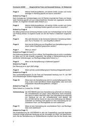Drucksache 22/2055 Bürgerschaft der Freien und Hansestadt Hamburg – 22. Wahlperiode Frage 3: Welche Aufforstungsflächen, mit welcher Größe, wurden vom Vorha benträger in Hamburg geprüft und warum verworfen? Antwort zu Frage 3: Nach Aussage des Vorhabenträgers sind 30 Flächen innerhalb der Freien und Hanse stadt Hamburg geprüft und aus unterschiedlichen Gründen als ungeeignet verworfen worden. Zu möglichen Gründen siehe Antwort zu 2. Frage 4: Welche Aufforstungsflächen, mit welcher Größe, wurden vom Vorha benträger in Schleswig-Holstein geprüft und warum verworfen? Antwort zu Frage 4: Die Stiftung Naturschutz Schleswig-Holstein wurde vom Vorhabenträger mit der Suche und Prüfung betraut, im Ergebnis wurde von dort die Fläche in Kattendorf vorgeschla gen. Frage 5: Wie viele Kilometer ist die Gemeinde Kattendorf, Gemarkung Katten dorf, Flur 6, Flurstück 121, vom Eingriffsort entfernt? Frage 6: Kann bei der Entfernung vom Eingriffsort zum Nachpflanzungsort von einem nahen Eingriffsort gesprochen werden? Frage 7: Wenn ja, wieso? Antwort zu Fragen 5, 6 und 7: Die Entfernung beträgt circa 25 km Luftlinie. Die Ersatzpflanzung ist nicht in unmittelba rer Nähe zum Ort des Eingriffs vorgesehen. Sie erfolgt in Übereinstimmung mit den rechtlichen Anforderungen, zur Rechtsgrundlage siehe Antwort zu 1. Frage 8: Wann ist die Nachpflanzung in Kattendorf geplant? Antwort zu Frage 8: Die Pflanzung ist im April 2020 erfolgt. Frage 9: Wann soll das Landschaftsprogramm Hamburg fertiggestellt werden? Antwort zu Frage 9: Das Landschaftsprogramm für die Freie und Hansestadt Hamburg vom 14. Juli 1997 wird anlassbezogen laufend fortgeschrieben. Frage 10: Wieso kann die Nachpflanzung nicht im Landschaftsprogramm Ham burg, in den in dem betroffenen Gebiet dargestellten, aber noch nicht umgesetzten Neuaufforstungsflächen, erfolgen? Antwort zu Frage 10: Siehe Antwort zu 2 sowie Drs. 22/1892. Vorbemerkung: Die HOCHBAHN plant eine Nachpflanzung außerhalb von Hamburg. Die Umweltbehörde hat gegen diese Maßnahme keine Einwände, weil diese im selben Naturraum liegt. Eine Nachpflanzung außerhalb von Hamburg sei von der Umweltbehörde nicht geplant. Mit Drs. 22/1892 teilt der Senat mit, dass eine Aufforstung von Wäldern außerhalb von Hamburg nicht geplant ist. Eine Verknüpfung der ver schiedenen Fach- und Rechtsgebiete sei nicht zielführend. Frage 11: Wieso ist eine Verknüpfung der verschiedenen Fach- und Rechtsge biete nicht zielführend? Antwort zu Frage 11: Die Ersatzpflanzung der HOCHBAHN im dem der Fragestellung zugrunde liegenden Verfahren erfolgt außerhalb Hamburgs auf der Grundlage von Wald- und Naturschutz recht. Bei der Nachpflanzung von Straßenbäumen ist jedoch das Ziel des Senats, dass 2