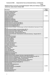 Drucksache 22/1668 Bürgerschaft der Freien und Hansestadt Hamburg – 22. Wahlperiode Anlage Staatliche Schulen, die mit dem Lernmanagementsystem "LMS Lernen Hamburg" ausgestattet wurden bzw. werden, Stand 6. Oktober 2020 Termin Schulname in 2020 Carl-von-Ossietzky-Gymnasium Gymnasium Klosterschule Heisenberg-Gymnasium Helene-Lange-Gymnasium Schule am Eichtalpark 14. KW Schule Maretstraße Stadtteilschule Lurup Stadtteilschule Oldenfelde Stadtteilschule Winterhude Abendschule Vor dem Holstentor Berufliche Schule Am Lämmermarkt (BS 31) Berufliche Schule Anckelmannstraße (BS 01) Berufliche Schule Burgstraße (BS 12) Berufliche Schule Eidelstedt (BS 24) Berufliche Schule für Banken, Versicherungen und Recht mit Beruflichem Gymnasium St. Pauli (BS 11) Berufliche Schule für Medien und Kommunikation (BS 17) Berufliche Schule Gesundheit Luftfahrt Technik (BS 10) Berufliche Schule Holz, Farbe, Textil (BS 25) Berufliche Schule Stahl- und Maschinenbau (BS 04) Berufliche Schule Wirtschaft, Verkehrstechnik und Berufsvorbereitung – Bergedorf (BS 07) Christianeum Friedrich-Ebert-Gymnasium Grundschule Poppenbüttel 24. KW Gymnasium Heidberg Gymnasium Meiendorf Gymnasium Osterbek Heinrich-Hertz-Schule Helmut-Schmidt-Gymnasium Kurt-Körber-Gymnasium Lise-Meitner-Gymnasium Matthias-Claudius-Gymnasium Max-Brauer-Schule Schule Redder Schule Sterntalerstraße Schule Stockflethweg Stadtteilschule Am Hafen Stadtteilschule Hamburg-Mitte Stadtteilschule Süderelbe Berufliche Schule Chemie, Biologie, Pharmazie, Agrarwirtschaft (BS 06) Berufliche Schule für medizinische Fachberufe auf der Elbinsel Wilhelmsburg (BS 15) Berufliche Schule für Sozialpädagogik - Anna-Warburg-Schule (BS 23) Berufliche Schule für Spedition, Logistik & Verkehr (BS 20) Berufliche Schule für Wirtschaft und Handel Hamburg - Mitte (BS 02) Berufliche Schule gewerbliche Logistik und Sicherheit (BS 27) Berufliche Schule Hamburg-Harburg (BS 18) Carl-Cohn-Schule Geschwister-Scholl-Stadtteilschule Grundschule Hoheluft 32. KW Grundschule Karlshöhe mit Zweigstelle Gymnasium Farmsen Gymnasium Ohmoor Immanuel-Kant-Gymnasium Lessing-Stadtteilschule 4