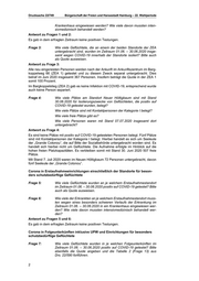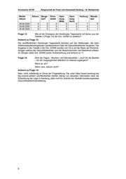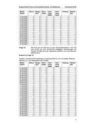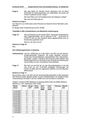 Drucksache 22/749 Bürgerschaft der Freien und Hansestadt Hamburg – 22. Wahlperiode Melde- Altona Berge Eims Ham Ham Harburg Wands datum dorf büttel burg- burg- bek Mitte Nord 28.06.2020 0 0 0 0 0 7 0 29.06.2020 0 0 0 0 0 0 1 30.06.2020 0 0 0 0 2 0 1 Frage 13: Wie ist die Divergenz der Hamburger Tageswerte mit denen aus der Tabelle 2 (Frage 13) der Drs. 22/590 zu erklären? Antwort zu Frage 13: Die veröffentlichten Hamburger Tageswerte beruhen auf den Meldungen, die beim infektionsepidemiologischen Landeszentrum über die Gesundheitsämter eingehen. Die Angaben in der Tabelle 2 der Drs. 22/590 wurden von f & w auf der Basis der Rückmel dungen seitens der Gesundheitsämter und der Bewohnerinnen und Bewohner erfasst. Im Übrigen siehe Drs. 22/590 sowie Vorbemerkung und Antwort zu 11. Frage 14: Sind die Tages-, Wochen- und Monatszahlen – auch für die Bezirke – für die Vergangenheit öffentlich im Internet zugänglich? Wenn ja, wo? Wenn nein, warum nicht? Antwort zu Frage 14: Nein, nicht vollständig im Sinne der Fragestellung. Die unter https://www.hamburg.de/ faq-corona-zahlen/ veröffentlichten Zahlen dienen zur aktuellen Information über die Entwicklung der Lage in Hamburg, aber nicht für Zwecke der Statistik beziehungsweise Gesundheitsberichterstattung. 6