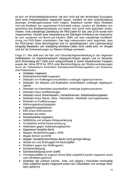 Seite 3 von 65 Polizeirevier Rheinsberg Frage 31, 33: Erfasste Fälle und Aufklärungsquoten für ausgewählte Deliktsfelder Erfasste Fälle Aufgeklärte Fälle Schlüs- Bezeichnung Anzahl gesamt AQ in % sel 2014 2015 2014 2015 ------ Straftaten insgesamt 806 764 59,8 57,5 200000 Rohheitsdelikte und ST gg. die persönliche Freiheit 116 105 96,6 95,2 222000 Gefährliche und schwere Körperverletzung 8 9 100,0 88,9 224000 Vorsätzliche einfache Körperverletzung § 223 StGB 49 48 98,0 95,8 435*00 Wohnungseinbruchdiebstahl 11 12 27,3 33,3 436*00 Tageswohnungseinbruchdiebstahl 4 5 0,0 40,0 ****00 Diebstahl insgesamt 333 295 27,9 30,2 ***100 Diebstahl insg. von Kraftwagen einschl. unbefugter Gebrauch 6 8 33,3 50,0 ***200 Diebstahl insg. von Moped/Krad einschl. unbefugte Gebrauch 4 3 25,0 100,0 ***300 Diebstahl insg. von Fahrrad einschl. unbefugter Gebrauch 20 19 10,0 26,3 *10*00 Diebstahl insg. in/aus Dienst-, Büro-, Fabrikations-,Werkstatt- u. Lagerräumen 25 16 40,0 0,0 *25*00 Diebstahl insg. in/aus Kiosken, Warenhäusern, Verkaufsräumen 12 25 83,3 68,0 *35*00 Diebstahl insg. in/aus Wohnungen 21 17 47,6 41,2 *40*00 Diebstahl insg. in/aus Boden-, Kellerräumen und Waschküchen 38 12 81,6 33,3 *50*00 Diebstahl insg. an/aus Kfz 40 36 7,5 5,6 500000 Vermögens- und Fälschungsdelikte 90 95 77,8 76,8 510000 Betrug 51 55 90,2 89,1 511000 Waren- und Warenkreditbetrug 23 34 100,0 94,1 512000 Grundstücks- und Baubetrug 513000 Kapitalanlage- und Anlagebetrug 514000 Geldkreditbetrug 1 100,0 515000 Erschleichen von Leistungen 1 2 100,0 100,0 516000 Betrug bzw. Computerbetrug mittels rechtswidrig erlangter unbarer Zahlungsmittel 1 2 0,0 50,0 517000 Sonstiger Betrug 26 16 84,6 81,3 520000 Veruntreuungen 4 2 75,0 100,0 521000 Untreue 3 1 66,7 100,0 522000 Vorenthalten und Veruntreuen von Arbeitsentgelt 1 1 100,0 100,0 523000 Missbrauch von Scheck- und Kreditkarten 530000 Unterschlagung 25 29 52,0 48,3 531000 Unterschlagung von Kfz 2 100,0 540000 Urkundenfälschung 9 9 77,8 88,9 541000 Fälschung technischer Aufzeichnungen 542000 Fälschung zur Erlangung von Btm 543000 Fälsch. beweiserhebl. Daten, Täusch. im Rechtsverkehr b. Datenverarb. 2 2 100,0 100,0 550000 Geld- und Wertzeichenfälschung 551000 Geld- und Wertzeichenfälschung einschl. Vorbereitungshandlungen 552000 Inverkehrbringen von Falschgeld §§ 146 Abs. 1 Nr. 3, 147 StGB 553000 Fälsch. v. Zahlungskarten mit/ohne Garantiefunktion, Schecks u. Wechseln 560000 Insolvenzstraftaten 1 100,0 561000 Bankrott 1 100,0 562000 Besonders schwerer Fall des Bankrotts 563000 Verletzung der Buchführungspflicht 564000 Gläubigerbegünstigung 565000 Schuldnerbegünstigung 621020 Widerstand gg. Vollstreckungsbeamte 1 1 100,0 100,0 674000 Sachbeschädigung 101 106 55,4 23,6 726200 ST gg. das Waffengesetz 13 9 92,3 88,9 731000 Allg. Verstöße gemäß § 29 BtMG (soweit nicht unter 7340 pp. zu erfassen) 14 20 92,9 95,0 732000 Unerl. Handel/Schmuggel mit/von Rauschgiften gemäß § 29 BtMG 5 4 100,0 100,0 733000 Unerl. Einfuhr von Btm gemäß § 30 Abs. 1 Nr. 4 BtMG (in ngM) 734800 Unerl. Handel, Herstellung, Abgabe und Besitz in ngM von Btm 1 9 100,0 100,0 899500 Sachbeschädigung durch Graffiti insgesamt 16 9 68,8 0,0