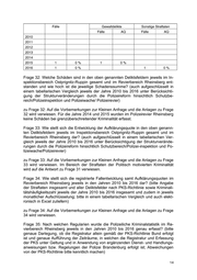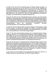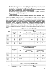 zu Frage 35: Es wird auf die Vorbemerkungen zur Kleinen Anfrage verwiesen. Im Polizeirevier Rheinsberg sind für die Jahre 2013 und 2014 bei den Straftaten der grenzüberschreitenden Kriminalität und für die Jahre 2013 bis 2015 bei den Strafta- ten mit Internetbezug keine nichtdeutschen Tatverdächtigen zu verzeichnen. Die ausschließlich nach den bundeseinheitlichen Richtlinien erfolgende Erfassung in der PKS setzte sich in den Jahren 2015 und 2016 unter Beibehaltung der Richtlinien- kompetenz und Fachaufsicht des Landeskriminalamtes fort. Frage 36: Wie stellt sich die Tatverdächtigenstruktur insgesamt nach Alter (Kinder, Jugendliche, Heranwachsende, Erwachsene), Geschlecht und Staatsangehörigkeit in den oben genannten Deliktsfeldern im Inspektionsbereich Ostprignitz-Ruppin gesamt und im Revierbereich Rheinsberg dar? (bitte auch aufgeschlüsselt in einem tabellari- schen Vergleich jeweils der Jahre 2010 bis 2016 unter Berücksichtigung der Struk- turveränderungen durch die Polizeireform hinsichtlich Schutzbe- reich/Polizeiinspektion und Polizeiwache/Polizeirevier) zu Frage 36: Auf die Vorbemerkungen zur Kleinen Anfrage und die Anlagen zu Frage 36 wird verwiesen. Im Bereich der Straftaten der Politisch motivierten Kriminalität kann systembedingt keine Aufschlüsselung der Tatverdächtigenstruktur nach Inspek- tions- und Revierbereichen im Sinne der Anfrage erfolgen. Frage 37: Wie viele Verkehrsunfälle ereigneten sich im Inspektionsbereich Ostprig- nitz-Ruppin gesamt und im Revierbereich Rheinsberg? (bitte Unterteilung in Ver- kehrsunfälle mit und ohne Personenschaden sowie nach Verkehrspflichtverstößen; auch aufgeschlüsselt in einem tabellarischen Vergleich jeweils der Jahre 2010 bis 2016 unter Berücksichtigung der Strukturveränderungen durch die Polizeireform hin- sichtlich Schutzbereich/Polizeiinspektion und Polizeiwache/Polizeirevier) Frage 38: Wie oft wurden im Inspektionsbereich Ostprignitz-Ruppin gesamt und im Revierbereich Rheinsberg Verkehrsüberwachungen und -kontrollen vorgenommen? (bitte nach kontrollierten Verkehrspflichtverstößen, nach der Anzahl der Arbeitsstun- den und den erfassten Überwachungseinsätzen ausweisen; auch aufgeschlüsselt in einem tabellarischen Vergleich jeweils der Jahre 2010 bis 2016 unter Berücksichti- gung der Strukturveränderungen durch die Polizeireform hinsichtlich Schutzbe- reich/Polizeiinspektion und Polizeiwache/Polizeirevier) zu den Fragen 37 und 38: Zahlen für das Gesamtjahr 2016 liegen noch nicht vor. Im Übrigen wird auf die Vorbemerkungen zur Kleinen Anfrage verwiesen.