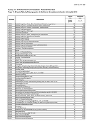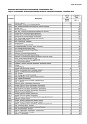 Seite 18 von 183 Auszug aus der Polizeilichen Kriminalstatistik - Polizeidirektion Süd Frage 17: Erfasste Fälle, Aufklärungsquoten für Delikte der Grenzüberschreitenden Kriminalität 2016 Erfasste Aufgeklärte Fälle Fälle Schlüssel Bezeichnung Anzahl AQ in % gesamt ------ Straftaten insgesamt 1.632 38,0 200000 Rohheitsdelikte und ST gg. die persönliche Freiheit 31 71,0 210000 Raub, räuberische Erpressung und räuberischer Angriff auf Kraftfahrer 13 69,2 210010 Sonstiger Raub 1 100,0 210040 Räuberischer Diebstahl 1 100,0 211000 Raub, räub. Erpressung auf Geldinstitute, Postfilialen und -agenturen 1 100,0 211100 Raubüberfälle auf Geldinstitute (Banken/Sparkassen) 1 100,0 211120 Schwerer Raub auf Geldinstitute (Banken/Sparkassen) 1 100,0 212000 Raubüberfälle auf sonstige Zahlstellen und Geschäfte 3 66,7 212050 Räub. Erpressung gg. sonstige Zahlstellen oder Geschäfte 2 100,0 212200 Raubüberfälle auf Tankstellen 1 0,0 212250 Räub. Erpressung gg. Tankstellen 1 0,0 216000 Handtaschenraub 1 0,0 216010 Handtaschenraub gemäß § 249 StGB 1 0,0 217000 Sonstige Raubüberfälle auf Straßen, Wegen oder Plätzen 6 66,7 217010 Sonst. Raub auf Straßen/Wegen/Plätzen 5 60,0 217020 Sonst. schw. Raub auf Straßen/Wegen/Plätzen 1 100,0 220000 Körperverletzung 17 70,6 222000 Gefährliche und schwere Körperverletzung 8 37,5 222010 Sonst. Tatörtlichkeit bei gefährl. Körperverletzung 1 0,0 222100 Gefährliche und schwere Körperverletzung auf Straßen, Wegen oder Plätzen 7 42,9 222110 Gefährl. Körperverletzung gemäß § 224 StGB 7 42,9 224000 Vorsätzliche einfache Körperverletzung § 223 StGB 9 100,0 230000 ST gg. die persönliche Freiheit 1 100,0 232000 Freiheitsber., Nötigung, Bedrohung, Zwangsheirat, Nachstellung (Stalking) 1 100,0 232200 Nötigung 1 100,0 232279 Sonstige Nötigung 1 100,0 3***** Diebstahl ohne erschwerende Umstände 181 59,7 3**100 EDS insg. von Kraftwagen einschl. unbefugter Gebrauch 2 0,0 3**300 EDS insg. von Fahrrad einschl. unbefugter Gebrauch 15 46,7 300000 EDS - Sonstiger 53 56,6 300010 EDS - Sonstiger gem. 242, 247, 248a StGB 53 56,6 300100 EDS von Kraftwagen einschl. unbefugter Ingebrauchnahme 2 0,0 300110 EDS - Diebstahl von Kraftwagen 2 0,0 300300 EDS von Fahrrädern einschl. unbefugter Ingebrauchnahme 15 46,7 300310 EDS - von Fahrrad 15 46,7 301*00 EDS in/aus Gärten, Gartenanlagen, Gartenkolonien 2 50,0 301000 Sonstiger EDS in/aus Gärten, Gartenanlagen, Gartenkolonien 1 0,0 301010 Sonstiger EDS in/aus Gärten, Gartenanlagen, Gartenkolonien 1 0,0 301300 EDS von Fahrrad in/aus Gärten, Gartenanlagen, Gartenkolonien 1 100,0 301310 EDS von Fahrrad in/aus Gärten, Gartenanlagen, Gartenkolonien 1 100,0 302*00 EDS in/aus Bungalow, Gartenlauben 7 0,0 302000 Sonstiger EDS in/aus Bungalow, Gartenlauben 7 0,0 302010 Sonstiger EDS in/aus Bungalow, Gartenlauben 7 0,0 303*00 EDS in/aus Bungalow, Gartenlauben, Gärten, Gartenanlagen, Gartenkolonien 9 11,1 304*00 EDS in/aus Garagen, Carports 7 71,4 304000 Sonstiger "einfacher" Diebstahl in/aus Garagen, Carports 7 71,4 304010 Sonstiger "einfacher" Diebstahl in/aus Garagen, Carports 7 71,4 310*00 EDS insg. in/aus Dienst-, Büro-, Fabrikations-, Werkstatt- und Lagerräumen 6 33,3 310000 EDS - in/aus Dienst-/Büror. - Sonstiger 6 33,3 315*00 EDS insg. in/aus Gaststätten, Kantinen, Hotels und Pensionen 1 0,0 315000 EDS - in/aus Gaststätten - Sonstiger 1 0,0 325*00 EDS insg. in/aus Kiosken, Warenhäusern, Verkaufsräumen 67 89,6 325000 EDS - in/aus Warenhäusern - Sonstiger 4 75,0 326*00 EDS insg. - Ladendiebstahl 63 90,5
