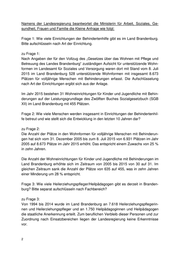 Namens der Landesregierung beantwortet die Ministerin für Arbeit, Soziales, Ge- sundheit, Frauen und Familie die Kleine Anfrage wie folgt: Frage 1: Wie viele Einrichtungen der Behindertenhilfe gibt es im Land Brandenburg. Bitte aufschlüsseln nach Art der Einrichtung. zu Frage 1: Nach Angaben der für den Vollzug des „Gesetzes über das Wohnen mit Pflege und Betreuung des Landes Brandenburg“ zuständigen Aufsicht für unterstützende Wohn- formen im Landesamt für Soziales und Versorgung waren dort mit Stand vom 8. Juli 2015 im Land Brandenburg 528 unterstützende Wohnformen mit insgesamt 8.673 Plätzen für volljährige Menschen mit Behinderungen erfasst. Die Aufschlüsselung nach Art der Einrichtungen ergibt sich aus der Anlage. Im Jahr 2015 bestehen 31 Wohneinrichtungen für Kinder und Jugendliche mit Behin- derungen auf der Leistungsgrundlage des Zwölften Buches Sozialgesetzbuch (SGB XII) im Land Brandenburg mit 455 Plätzen. Frage 2: Wie viele Menschen werden insgesamt in Einrichtungen der Behindertenhil- fe betreut und wie stellt sich die Entwicklung in den letzten 10 Jahren dar? zu Frage 2: Die Anzahl der Plätze in den Wohnformen für volljährige Menschen mit Behinderun- gen hat sich vom 31. Dezember 2005 bis zum 8. Juli 2015 von 6.931 Plätzen im Jahr 2005 auf 8.673 Plätze im Jahr 2015 erhöht. Das entspricht einem Zuwachs von 25 % in zehn Jahren. Die Anzahl der Wohneinrichtungen für Kinder und Jugendliche mit Behinderungen im Land Brandenburg erhöhte sich im Zeitraum von 2005 bis 2015 von 30 auf 31. Im gleichen Zeitraum sank die Anzahl der Plätze von 635 auf 455, was in zehn Jahren einer Minderung um 28 % entspricht. Frage 3: Wie viele Heilerziehungspfleger/Heilpädagogen gibt es derzeit in Branden- burg? Bitte separat aufschlüsseln nach Fachbereich? zu Frage 3: Von 1994 bis 2014 wurde im Land Brandenburg an 7.618 Heilerziehungspflegerin- nen und Heilerziehungspfleger und an 1.750 Heilpädagoginnen und Heilpädagogen die staatliche Anerkennung erteilt. Zum beruflichen Verbleib dieser Personen und zur Zuordnung nach Einsatzbereichen liegen der Landesregierung keine Erkenntnisse vor.