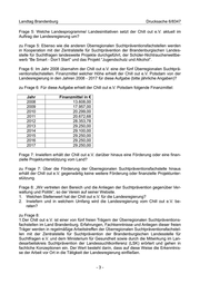 Landtag Brandenburg Drucksache 6/8347 Frage 5: Welche Landesprogramme/ Landesinitiativen setzt der Chill out e.V. aktuell im Auftrag der Landesregierung um? zu Frage 5: Ebenso wie die anderen Überregionalen Suchtpräventionsfachstellen werden in Kooperation mit der Zentralstelle für Suchtprävention der Brandenburgischen Landes- stelle für Suchtfragen landesweite Projekte durchgeführt, der Schüler-Nichtraucherwettbe- werb “Be Smart - Don’t Start” und das Projekt “Jugendschutz und Alkohol”. Frage 6: Im Jahr 2008 übernahm der Chill out e.V. eine der fünf Überregionalen Suchtprä- ventionsfachstellen. Finanzmittel welcher Höhe erhielt der Chill out e.V. Potsdam von der Landesregierung in den Jahren 2008 - 2017 für diese Aufgabe (bitte jährliche Angaben)? zu Frage 6: Für diese Aufgabe erhielt der Chill out e.V. Potsdam folgende Finanzmittel: Jahr Finanzmittel in € 2008 13.608,00 2009 17.957,00 2010 20.299,00 2011 20.672,68 2012 28.353,78 2013 29.250,00 2014 29.100,00 2015 29.250,00 2016 29.250,00 2017 29.250,00 Frage 7: Inwiefern erhält der Chill out e.V. darüber hinaus eine Förderung oder eine finan- zielle Projektunterstützung vom Land? zu Frage 7: Über die Förderung der Überregionalen Suchtpräventionsfachstelle hinaus erhält der Chill out e.V. gegenwärtig keine weitere Förderung oder finanzielle Projektunter- stützung. Frage 8: „Wir vertreten den Bereich und die Anliegen der Suchtprävention gegenüber Ver- waltung und Politik“, so der Verein auf seiner Website. 1. Welchen Stellenwert hat der Chill out e.V. für die Landesregierung? 2. Inwiefern und in welchem Umfang wird die Landesregierung vom Chill out e.V. be- raten? zu Frage 8: 1.Der Chill out e.V. ist einer von fünf freien Trägern der Überregionalen Suchtpräventions- fachstellen im Land Brandenburg. Erfahrungen, Fachkenntnisse und Anliegen dieser freien Träger werden in regelmäßige Arbeitstreffen der Überregionalen Suchtpräventionsfachstel- len mit der Zentralstelle für Suchtprävention der Brandenburgischen Landesstelle für Suchtfragen e.V. und dem Ministerium für Gesundheit sowie durch die Mitwirkung im Lan- desarbeitskreis Suchtprävention der Landessuchtkonferenz (LSK) erörtert und gehen in fachliche Konzeptionen ein. Der Wert besteht darin, dass auf diese Weise die Erkenntnis- se der Arbeit vor Ort in die Tätigkeit der Landesregierung einfließen. -3-
