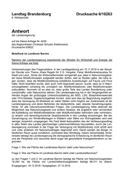 Landtag Brandenburg Drucksache 6/10263 6. Wahlperiode Antwort der Landesregierung auf die Kleine Anfrage Nr. 4039 des Abgeordneten Christoph Schulze (fraktionslos) Drucksache 6/9922 Mobilfunk im Landkreis Barnim Namens der Landesregierung beantwortet der Minister für Wirtschaft und Energie die Kleine Anfrage wie folgt: Vorbemerkungen des Fragenstellers: In der Landtagssitzung am 15.11.2018 in der Aktuel- len Stunde zum Thema „Klare Regeln für 5 G -Vergabe: Fairer Mobilfunknetzausbau für Stadt und Land „ führte der Wirtschaftsminister sinngemäß aus, dass in Naturschutzgebie- ten keine Mobilfunkmasten aufgestellt werden dürfen, weil es Studien gäbe, die nahe le- gen würden, dass die Mobilfunkstrahlung schädliche Auswirkungen auf Fauna und Flora hätte. Nicht bestritten wurde, aber auch nicht begründet warum, wurde, dass es in Natur- schutzgebieten schwierig bis unmöglich sei, Mobilfunktstationen oder Mobilfunkmasten aufzustellen. Nunmehr ist es aber so, dass große Teile des Landes Brandenburg unter Landschafts- oder Naturschutz stehen. Die Landesregierung hat in der Vergangenheit se- henden Auges die großzügige Unterschutzstellung als NSG, LSG, Biosphärenreservate oder FFH-Gebiete, Vogelschutzgebiete forciert. Jetzt wird dies als Begründung angeführt, dass die Versorgung mit Mobilnetz an vielen Stellen nicht möglich sei. Andererseits ist die Landesregierung und deren Behörden die letztendliche, weil, oberste Genehmigungsbe- hörde, für alle naturschutzrechtlichen Fragen. Die Landesregierung hätte jederzeit die Möglichkeit das Naturschutzgesetz und andere Gesetze, die angeblich oder vermeintlich die Aufstellung von Mobilfunktstationen oder Mobilfunkmasten behindern oder verhindern, zu ändern und dementsprechende Gesetzentwürfe in den Landtag einzubringen. Bei der Genehmigung von Windkraftanlagen in Wäldern oder Nähe von Wohngebieten wird weit weniger zimperlich umgegangen. Als Fazit bleibt festzustellen das der Verfassungsauftrag in allen Teilen des Landes gleichwertiger Lebensverhältnisse herzustellen, durch die Lan- desregierung zumindest in der Frage der Versorgung mit Mobilfunknetz nicht erfüllt wird und unter anderem mit Naturschutzfragen begründet wird. Damit werden die Bürger im ländlichen Raum quasi vorsätzlich, zumindest aber fahrlässig, massiv benachteiligt. Ande- rerseits beklagt die Landesregierung die demographische Entwicklung im ländlichen Raum und der Peripherie und versuchte damit sogar die gescheiterte Kreisgebietsreform zu be- gründen. Frage 1: Wie viel Fläche des Landkreises Barnim steht unter Naturschutz? Frage 2: Wie viel Fläche im Landkreis Barnim steht unter Landschaftsschutz? zu den Fragen 1 und 2: Im Landkreis Barnim beträgt die Fläche von Naturschutzgebieten 16.294 ha, die Fläche von Landschaftsschutzgebieten beträgt 88.311 ha (Stand: Eingegangen: 18.12.2018 / Ausgegeben: 27.12.2018