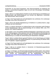 Landtag Brandenburg Drucksache 6/10263 30.09.2016). Es wird darauf hingewiesen, dass Naturschutzgebiete oft vollständig oder anteilig in Landschaftsschutzgebieten liegen und sich dann die jeweiligen Schutzkatego- rien überlagern. Frage 3: Gibt es im Landkreis Barnim Probleme mit der Genehmigung und Aufstellung von Mobilfunkmasten oder Mobilfunktstationen aus Gründen des allgemeinen Landschafts- oder Naturschutzes? Wenn ja welche? zu Frage 3: Die Frage bezieht sich auf Zuständigkeiten des Landkreises. Der Landesregie- rung liegen hierzu keine Informationen vor. Frage 4: Wie ist die aktuelle Netzabdeckung mit Mobilfunk im Landkreis Barnim, aufge- schlüsselt nach den Gemeinden? Frage 5: In welchen Gemeinden im Landkreis Barnim gibt es besonders große Probleme mit der Netzabdeckung? Gibt es Zusammenhänge mit mit örtlichen NSG, LSG, FFH- gebieten oder Vogelschutzgebieten? zu den Fragen 4 und 5: Die drahtlose Breitbandverfügbarkeit in Deutschland wird auf Ebe- ne der Planungsregionen näherungsweise durch den Breitbandatlas der Bundesregierung dargestellt. Dem MWE liegen keine konkreten Daten der einzelnen Mobilfunkanbieter zur Netzabdeckung vor, da diese der Geheimhaltung der Netzbetreiber unterliegen. Frage 6: Gibt im Landkreis Barnim generell Probleme mit der Genehmigung und Aufstel- lung von Mobilfunkmasten oder Mobilfunktstationen im Zusammenhang mit örtlichen NSG, LSG, FFH-gebieten, Vogelschutzgebieten? zu Frage 6: Die Frage bezieht sich auf Zuständigkeiten des Landkreises. Der Landesregie- rung liegen hierzu keine Informationen vor. Frage 7: Gibt es im Landkreis Barnim in Gemeinden mit Netzabdeckungsproblemen gleichfalls Windkraftanlagen? zu Frage 7: Im Energie- und Klimaschutzatlas Brandenburg (EKS) werden unter anderem Windkraftanlagen in Brandenburg dargestellt. Bezüglich der Netzabdeckung in diesen Ge- bieten verweist die Landesregierung auf den Breitbandatlas des Bundes (https://www.bmvi.de/DE/Themen/Digitales/Breitbandausbau/Breitbandatlas- Karte/start.html). -2-