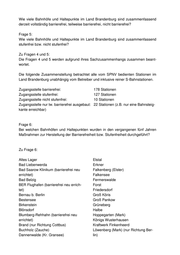 Wie viele Bahnhöfe und Haltepunkte im Land Brandenburg sind zusammenfassend derzeit vollständig barrierefrei, teilweise barrierefrei, nicht barrierefrei? Frage 5: Wie viele Bahnhöfe und Haltepunkte im Land Brandenburg sind zusammenfassend stufenfrei bzw. nicht stufenfrei? Zu Fragen 4 und 5: Die Fragen 4 und 5 werden aufgrund ihres Sachzusammenhangs zusammen beant- wortet. Die folgende Zusammenstellung betrachtet alle vom SPNV bedienten Stationen im Land Brandenburg unabhängig vom Betreiber und inklusive reiner S-Bahnstationen. Zugangsstelle barrierefrei: 178 Stationen Zugangsstelle stufenfrei: 127 Stationen Zugangsstelle nicht stufenfrei: 10 Stationen Zugangsstelle nur tw. barrierefrei ausgebaut: 22 Stationen (z.B. nur eine Bahnsteig- kante erreichbar) Frage 6: Bei welchen Bahnhöfen und Haltepunkten wurden in den vergangenen fünf Jahren Maßnahmen zur Herstellung der Barrierefreiheit bzw. Stufenfreiheit durchgeführt? Zu Frage 6: Altes Lager Elstal Bad Liebenwerda Erkner Bad Saarow Klinikum (barrierefrei neu Falkenberg (Elster) errichtet) Falkensee Bad Belzig Fermerswalde BER Flughafen (barrierefrei neu errich- Forst tet) Friedersdorf Bernau b. Berlin Groß Köris Bestensee Groß Pankow Birkenstein Grüneberg Blönsdorf Halbe Blumberg-Rehhahn (barrierefrei neu Hoppegarten (Mark) errichtet) Königs Wusterhausen Brand (nur Richtung Cottbus) Kraftwerk Finkenheerd Buchholz (Zauche) Löwenberg (Mark) (nur Richtung Ber- Dannenwalde (Kr. Gransee) lin)