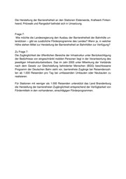 Die Herstellung der Barrierefreiheit an den Stationen Elsterwerda, Kraftwerk Finken- heerd, Pritzwalk und Rangsdorf befindet sich in Umsetzung. Frage 7: Wie möchte die Landesregierung den Ausbau der Barrierefreiheit der Bahnhöfe un- terstützen – gibt es zusätzliche Förderprogramme des Landes? Wenn ja, in welcher Höhe stehen Mittel zur Herstellung der Barrierefreiheit an Bahnhöfen zur Verfügung? Zu Frage 7: Die Zugänglichkeit der öffentlichen Bereiche der Infrastruktur unter Berücksichtigung der Bedürfnisse von eingeschränkt mobilen Personen liegt in der Verantwortung des jeweiligen Infrastrukturbetreibers. Das im Jahr 2005 unter Mitwirkung der Verbände nach dem Gesetz zur Gleichstellung behinderter Menschen (BGG) beschlossene Programm der Deutschen Bahn sieht vor, barrierefreie Zugänge bei Reisendenzah- len ab 1.000 Reisenden pro Tag bei umfassenden Umbauten oder Neubauten zu realisieren. Für Stationen mit weniger als 1.000 Reisenden unterstützt das Land Brandenburg die Herstellung der barrierefreien Zugänglichkeit entsprechend der Verfügbarkeit von Fördermitteln in den vorhandenen, einschlägigen Förderprogrammen.