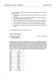 Niedersächsischer Landtag − 15. Wahlperiode Drucksache 15/3224 Kleine Anfrage mit Antwort Wortlaut der Kleinen Anfrage der Abgeordneten Georgia Langhans, Filiz Polat (GRÜNE), eingegangen am 13.06.2006 Verschärfte Abschiebepraxis in Niedersachsen 2004/2005 Im Jahr 2005 hat Deutschland 16 865 Menschen auf dem Luftweg abgeschoben. Bei 1 983 Perso- nen ist das unter Anwendung von „Hilfsmitteln der körperlichen Gewalt“ geschehen. Auch in Nie- dersachsen werden kritische Stimmen gegen eine harte Abschiebepolitik laut. Abschiebung von lang in Niedersachsen lebenden und gut integrierten Menschen, das Auseinanderreißen von Fami- lien, die Abschiebung von Kindern und Jugendlichen und die Ausweisung von gesundheitlich be- einträchtigten Personen sind keine Ausnahmen. Vor diesem Hintergrund fragen wir die Landesregierung: 1. Wie viele Menschen wurden 2004/2005 aus Niedersachsen abgeschoben a) unter Begleitung der Landespolizei/Bundespolizei, b) unter Begleitung von Beamten der Zielländer (bitte aufschlüsseln), c) unter gesundheitlichen Beeinträchtigungen (welcher Art?), d) unter Begleitung von Ärzten, e) unter Anwendung von Hilfsmitteln der körperlichen Gewalt (nach § 69 Abs. 3 Nds. SOG)? 2. In welche Zielländer wurde im angegebenen Zeitraum abgeschoben? 3. Wie viele Personen wurden mit Charterflügen bzw. Linienflügen abgeschoben (Fluggesell- schaften bitte aufschlüsseln)? 4. Was passiert mit dem zurückgelassenen Besitz der abgeschobenen Personen? 5. Wie viele Kinder unter 16 Jahren wurden im benannten Zeitraum in Abschiebehaft genommen bzw. abgeschoben? 6. Wie viele Personen haben nach einer Aufenthaltsaufkündigung das Land freiwillig verlassen? 6. Wie viele Abschiebungsversuche mussten 2004/2005 abgebrochen werden a) im Vergleich zum Zeitraum 1999 bis 2002, b) im Vergleich zum Zeitraum 2003 bis 2005, c) aufgrund des aktiven Widerstands des/der Betroffenen, d) aus gesundheitlichen bzw. medizinischen Gründen (z. B. Schwangerschaft), e) aus humanitären Gründen, f) weil sich die Person der Rückführung entzogen hat, g) wegen Kapazitätsmangels einer Chartermaschine, h) weil die Zielländer die Aufnahme verweigerten, i) wegen fehlender Papiere/unklarer Identität? 8. Bei Abschiebungen in das Kosovo gilt seit dem 26. April 2005 ein Abkommen zwischen BAMF und der UNMIK über ein individuelles Screeningverfahren, um die Rückkehr der Flüchtlinge 1