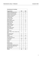 Niedersächsischer Landtag – 15. Wahlperiode Drucksache 15/3224 Abschiebungen mit Linienflügen Fluggesellschaft 2004 2005 Lufthansa, Santa Barbara Airlines 1 0 Lufthansa, SN Brussels Airlines 6 12 Lufthansa, Taca Intl. Air Airlines 0 1 Lufthansa, Thai Airways Intl. 0 1 Lufthansa, Air Europe 0 1 Lufthansa Alitalia 1 0 LOT Polish, Airlines 0 1 Albanian Airlines 1 0 Malev Hungarian Airlines 2 22 Middle East Airlines 4 18 Czech Airlines CSA 3 6 Pegasus Airlines 0 1 Pakistan International 0 4 Ukraine Intl. Airlines 1 3 Qatar Airways 0 17 Quatar Airways, Airblue 0 5 Syrian Arab Airlines 4 1 Tarom 1 3 Siberia Airlines 0 3 Siberia Airlines, Pulkovo Aviation Enter- 0 2 prise Skandinavian Airlines 4 3 Singapore Airlines 0 1 Aeroflot 23 23 Lithuanian Airlines 0 1 Thai Airways International 1 15 Turkish Airlines 109 237 Air Lithuania 0 1 Tunisair 0 1 Armavia 0 2 Sirlankan Airlines 1 6 Transaero Airlines 2 6 Transaero Airlines, Uzbekistan Airways 0 1 Transaero Airlines, Siberia Airlines 1 7 Montenegro Airlines 47 70 Öger Türk Tours 1 1 Gesamt 402 728 5