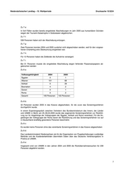 Niedersächsischer Landtag – 15. Wahlperiode Drucksache 15/3224 Dieses vorausgeschickt, beantworte ich die Kleine Anfrage namens der Landesregierung wie folgt: Zu 1 a: 2004 2005 Landespolizei 1.843 Personen 1.336 Personen Bundespolizei 553 Personen 420 Personen Zu 1 b: Rückführungen unter Begleitung von Sicherheitskräften eines Ziellandes erfolgen bisher nur in das Kosovo; 2004: 112 Personen, 2005: 110 Personen. Zu 1 c: Zahlenmäßige Angaben zu abgeschobenen Personen mit gesundheitlichen Beeinträchtigungen, die deren Flugreisetauglichkeit jedoch nicht beeinträchtigte, können nicht gemacht werden, da dies den mit der Aufenthaltsbeendigung befassten Behörden regelmäßig nicht bekannt wird. Zu 1 d: 2004: 45 Personen, 2005: 50 Personen. Zu 1 e: Die Anwendung von körperlicher Gewalt durch Polizeivollzugsbeamte auf der Grundlage des Nds. SOG bei der Durchsetzung von Polizeivollzugsmaßnahmen wird statistisch nicht erfasst. Zu 2: In folgende Länder (gegliedert nach Erdteilen) wurde im Jahr 2004 abgeschoben: Europa Albanien, Belarus, Bosnien-Herzegowina, Bulgarien, Dänemark, Estland, Finnland, Frankreich, Griechenland, Großbritannien und Nordirland, Island, Italien, Kroatien, Lettland, Litauen, Mazedo- nien, Moldau, Niederlande, Polen, Portugal, Rumänien, Russland, Schweden, Serbien und Monte- negro einschließlich Kosovo, Slowakei, Slowenien, Spanien, Tschechische Republik, Türkei, Un- garn, Ukraine. Afrika Ägypten, Algerien, Angola, Cote d‘Ivoire, Dem. Rep. Kongo, Kongo (Brazzaville) Eritrea, Gambia, Ghana, Guinea, Kamerun, Libyen, Marokko, Nigeria, Senegal, Sierra Leone, Sudan, Togo, Tune- sien. Asien Afghanistan, Armenien, Aserbaidschan, Georgien, Indien, Indonesien, Iran, Israel, Jordanien, Ka- sachstan, Kirgistan, Libanon, Mongolei, Nepal, Pakistan, Palästina, Sri Lanka, Syrien, Tadschikis- tan, Thailand, VR China, Vietnam. Amerika Brasilien, Chile, Dominikanische Republik, Ecuador, Haiti, Kanada, Kolumbien, Paraguay, Peru, Venezuela, Vereinigte Staaten von Amerika In folgende Länder (gegliedert nach Erdteilen) wurde im Jahr 2005 abgeschoben: Europa Albanien, Belarus, Bosnien-Herzegowina, Bulgarien, Dänemark, Estland, Finnland, Frankreich, Griechenland, Italien, Kroatien, Lettland, Litauen, Mazedonien, Moldau, Niederlande, Norwegen, 3