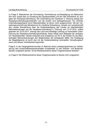 Landtag Brandenburg Drucksache 6/11250 Frage 2: Zur Umsetzung des neuen Wassergesetzes, welches ab 2021 differenzierte Bei- träge für Landbesitzer vorgibt, soll noch in diesem Jahr der Entwurf einer Verordnung vor- gelegt werden. Darin können feste Prozentsätze oder Spannen vorgegeben werden. Wird jedem Gewässerunterhaltungsverband, aufgrund der in jedem Verband anderen Vertei- lung der Nutzungsarten, die Gelegenheit gegeben, zu dem Entwurf der Verordnung in an- gemessener Frist eine Stellungnahme abzugeben? zu Frage 2: Die Landesregierung wendet bereits bei der Erstellung des Verordnungsent- wurfs ein transparentes Beteiligungskonzept an, welches die Gewässerunterhaltungsver- bände, die betroffenen Interessenverbände und die kommunalen Spitzenverbände einbe- zieht. Im Übrigen richtet sich die Beteiligung der Gewässerunterhaltungsverbände nach der Gemeinsamen Geschäftsordnung für die Ministerien des Landes Brandenburg (GGO). Frage 3: Reparaturkosten, die durch Schäden nach besonderen Naturereignissen ent- standen sind, werden für Gewässer 1. Ordnung vom Land erstattet. In welchem Umfang und unter welchen Bedingungen könnten auch Schäden an Gewässern 2. Ordnung nach besonderen Naturereignissen erstattet werden? zu Frage 3: Eine Beteiligung an Kosten zur Schadensbeseitigung an Gewässern II. Ord- nung in Folge von Naturereignissen wäre eine freiwillige Leistung des Landes. Haushalts- mittel für derartige Zwecke werden nicht als Vorhaltepositionen in Haushaltsplänen be- rücksichtigt. Haushaltsmittelbedarfe im Ereignisfall einer Naturkatastrophe gelten regel- mäßig als außerplanmäßig und wären gegebenenfalls mit Begründung ihrer Unvorherseh- barkeit und Unabweisbarkeit vom federführenden Ressort beim Ministerium der Finanzen zu beantragen. Frage 4: Das Gesetz über die Bildung von Gewässerunterhaltungsverbänden regelt in § 6: „Die Verbände haben zur Sicherung des Haushaltes angemessene Rücklagen zu bilden. Näheres kann durch die Rechtsverordnung nach Absatz 1 Satz 3 geregelt werden“. Kön- nen Gewässerunterhaltungsverbände im Wirtschaftsplan rechtssicher Rücklagen für Vor- sorgemaßnahmen für besondere Naturereignisse bilden? Wann wird die erwähnte Rechtsverordnung erlassen, um unter anderem die Zulässigkeit solcher Rücklagen nach Art und Höhe klarzustellen? zu Frage 4: Grundsätzlich haben die Verbände gemäß § 6 Absatz 4 Gesetz über die Bil- dung von Gewässerunterhaltungsverbänden (GUVG) angemessene Rücklagen zur Siche- rung des Haushaltes zu bilden. Daneben können grundsätzlich auch angemessene Rück- lagen für andere Zwecke gebildet werden. Voraussetzung ist eine entsprechende Rege- lung in der Satzung des Verbandes, die den Zweck ausdrücklich bezeichnet. Eine ent- sprechende Regelung ist von der Rechtsaufsichtsbehörde zu genehmigen (vgl. § 58 Ab- satz 1 Wasserverbandsgesetz). Grundsätzlich sind auch Rücklagen zur Vorsorge für be- sondere Naturereignisse zulässig. Der Erlass einer Rechtsverordnung zur Regelung von Rücklagen ist derzeit nicht geplant. Frage 5: Für Mehraufwand bei der Gewässerunterhaltung durch Biberschäden gibt es eine Erstattung des Landes an die Wasser- und Bodenverbände. Die Bagatellgrenze liegt bei 10.000 €, die Kosten werden zu 50 % vom Land erstattet. Wie werden die Höhe der Baga- tellgrenze und die Begrenzung des Schadensausgleichs begründet? -2-