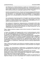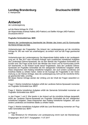Landtag Brandenburg Drucksache 6/6959 6. Wahlperiode Antwort der Landesregierung auf die Kleine Anfrage Nr. 2740 der Abgeordneten Andreas Kalbitz (AfD-Fraktion) und Steffen Königer (AfD-Fraktion) Drucksache 6/6727 Flughafen Schönefeld bzw. BER Namens der Landesregierung beantwortet der Minister des Innern und für Kommunales die Kleine Anfrage wie folgt: Vorbemerkungen der Fragesteller: Die Antwort der Landesregierung auf die mündliche Anfrage Nr. 943 war mehr als unbefriedigend, da einfach nicht auf die Frage geantwortet wurde. Vorbemerkungen der Landesregierung: Der Abgeordnete Kalbitz stellte in der Landtagssit- zung am 18. Mai 2017 eine mündliche Anfrage nach zusätzlichen hoheitlichen Aufgaben des Landkreises Dahme-Spreewald, die mit dem Betrieb des Flughafens Schönefeld ver- bunden sind. Die Frage wurde durch den Minister des Innern und für Kommunales schrift- lich beantwortet. In der Antwort wurde darauf hingewiesen, dass der Landkreis Dahme- Spreewald am Flughafen Schönefeld die ihm obliegenden hoheitlichen Aufgaben erfüllt. Diese entsprechen dem Katalog hoheitlicher Aufgaben, den auch andere Landkreise und kreisfreie Städte zu erfüllen haben. Daher ist die Aussage der Fragesteller in der Vorbe- merkung zu der Kleinen Anfrage, dass die Landesregierung nicht auf die mündliche Anfra- ge geantwortet hätte, unrichtig. Mit dieser Kleinen Anfrage werden der Umfang und der Inhalt der Fragen wesentlich er- weitert. Frage 1: Welche hoheitlichen Aufgaben erfüllt der Landkreis Dahme-Spreewald momentan am Flughafen Schönefeld bzw. BER? Frage 2: Welche hoheitlichen Aufgaben erfüllt die Gemeinde Schönefeld momentan am Flughafen Schönefeld bzw. BER? zu den Fragen 1 und 2: Wie bereits in der Antwort auf die mündliche Anfrage dargestellt, erfüllt der Landkreis Dahme-Spreewald am Flughafen Schönefeld die ihm obliegenden hoheitlichen Aufgaben. Diese entsprechen dem Katalog hoheitlicher Aufgaben, den auch andere Landkreise und kreisfreie Städte zu erfüllen haben. Frage 3: Welche hoheitlichen Aufgaben erfüllt das Land Brandenburg momentan am Flug- hafen Schönefeld bzw. BER? zu Frage 3: - Das Ministerium für Infrastruktur und Landesplanung nimmt nach der Brandenburgi- Eingegangen: 06.07.2017 / Ausgegeben: 11.07.2017