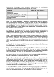 Frage 6: Aus welchen Straftaten setzen sich die “sonstigen Straftaten” im Phäno- menbereich PMK-rechts zusammen? Wie viele Delikte gab es in den jeweiligen Ka- tegorien im Juni 2016? zu Frage 6: Die nachfolgende Auflistung enthält eine Aufschlüsselung der in Beant- wortung der Frage 1 aufgeführten 97 „sonstigen Straftaten“. Verletzte Rechts- Bezeichnung der Straftat Anzahl der Fälle norm Verwenden von Kennzeichen verfassungs- widriger Organisationen § 86a StGB 69 Volksverhetzung § 130 StGB 12 Beleidigung § 185 StGB 9 Üble Nachrede und Verleumdung gegen § 188 StGB 1 Personen des politischen Lebens Nötigung § 240 StGB 1 Sachbeschädigung § 303 StGB 5 Anzahl der sonstigen Delikte im Land BB 97 Frage 7: Wie viele Nachmeldungen rechtsextremistisch motivierter Straftaten gab es bis zum 30. Juni für das Jahr 2016? zu Frage 7: Ausgehend von den in der Beantwortung der Kleinen Anfragen Nr. 1475, 1587, 1656, 1803 und 1903 genannten statistischen Angaben wurden bis zum Zeit- punkt der Erhebung für das Jahr 2016 insgesamt 118 Straftaten nachgemeldet. Frage 8: Wie viele dieser nachgemeldeten Straftaten waren Gewalttaten? Bitte auf- geschlüsselt nach Ort, Delikt, Tatzeit, Tatort, Landkreis, Herkunftsland der/s Opfer/s, Anzahl der Opfer und der Täter, Tat nach dem Strafgesetzbuch angeben. Welche dieser Straftaten waren extremistisch ausgeprägt? Welchen Kategorien im Themen- feld Hasskriminalität (fremdenfeindlich, antisemitisch, Gewalt gegen Linke, Gewalt gegen sonstige politische Gegner) sind diese Taten zuzuordnen? zu Frage 8: Bei den in der Antwort zu Frage 7 nachgemeldeten Straftaten handelt es sich in 20 Fällen um extremistische Gewaltstraftaten. Hierzu wird auf die Beantwor- tungen der Frage 8 der Kleinen Anfragen 1587, 1803 und 1903 (Drs. 6/4057, 6/4515 und 6/4822 – zehn Nachmeldungen) verwiesen. Eine dezidierte Aufstellung zu den weiteren Punkten der Fragestellung für die weiteren zehn Fälle ist der Anlage 2 zu entnehmen. Darüber hinaus wurden drei Gewaltstraftaten (Kleine Anfrage 1475 - Drs. 6/3731, Anlage 1, lfd. Nr. 1; Kleine Anfrage 1803 – Drs. 6/4515, Anlage 1, lfd. Nr. 2 und 3) gelöscht, da sich ein politisch motivierter Tathintergrund nicht bestätigt hat.