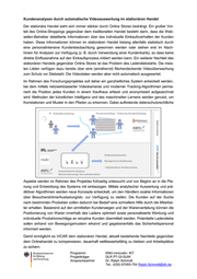 Anhang Kundenanalysen durch automatische Videoauswertung im stationären Handel Der stationäre Handel sieht sich immer stärker durch Online Stores bedrängt. Ein großer Vor- teil des Online-Shoppings gegenüber dem traditionellen Handel besteht darin, dass die Web- seiten-Betreiber detaillierte Informationen über das individuelle Einkaufsverhalten der Kunden haben. Diese Informationen können im stationären Handel bislang allenfalls statistisch durch eine personalintensive Kundenbeobachtung gewonnen werden oder stehen erst im Nach- hinein für Analysen zur Verfügung (z. B. durch Verwendung einer Kundenkarte), so dass keine direkte Einflussnahme auf den Einkaufsprozess initiiert werden kann. Ein weiterer Nachteil des stationären Handels gegenüber Online Stores ist das Problem des Ladendiebstahls. Die meis- ten Läden verfügen dazu bereits über eine (annähernd) flächendeckende Videoüberwachung zum Schutz vor Diebstahl. Die Videodaten werden aber nicht automatisch ausgewertet. Im Rahmen des Forschungsprojektes soll daher ein ganzheitliches System entwickelt werden, bei dem mittels netzwerkbasierter Videokameras und moderner Tracking-Algorithmen perma- nent die Position jedes Kunden in einem Kaufhaus erfasst und anonymisiert aufgezeichnet wird. Methoden der künstlichen Intelligenz und des maschinellen Lernens werden genutzt, um Korrelationen und Muster in den Pfaden zu erkennen. Dabei auftretende datenschutzrechtliche Aspekte werden im Rahmen des Projektes frühzeitig untersucht und von Beginn an in die Pla- nung und Entwicklung des Systems mit einbezogen. Mittels analytischer Auswertung und prä- diktiver Algorithmen werden neue Konzepte entwickelt, um den Händlern exakte Informationen über Besucherströme/Auslastung/etc. zur Verfügung zu stellen. Die Kunden auf der Suche nach bestimmten Produkten sollen dadurch bei Bedarf eine schnellere Hilfe durch die Mitarbei- ter erhalten. Basierend auf den ermittelten Kundenwegen und der Warenverteilung können die Positionierung von Waren innerhalb des Ladens optimiert sowie personalisierte Werbung und individuelle Produktvorschläge an einzelne Kunden übermittelt werden. Potentielle Ladendiebe sollen anhand von Bewegungsmustern erkannt und gegebenenfalls das Sicherheitspersonal informiert werden. Damit ermöglicht es VICAR dem stationären Handel, aktuell bestehende Nachteile gegenüber dem Onlinehandel zu kompensieren, dauerhaft wettbewerbsfähig zu bleiben und Arbeitsplätze zu sichern. Programm Projektträger Ansprechpartner KMU-innovativ: IKT DLR PT-GI-SUW Dr. Ralph Schmidt Tel.: (030) 67055-754 Ralph.Schmidt@dlr.de