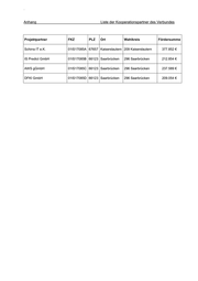 Anhang Anhang Liste der Kooperationspartner des Verbundes Projektpartner FKZ PLZ Ort Wahlkreis Fördersumme Schirra IT e.K. 01IS17085A 67657 Kaiserslautern 209 Kaiserslautern 377.852 € IS Predict GmbH 01IS17085B 66123 Saarbrücken 296 Saarbrücken 212.854 € AWS gGmbH 01IS17085C 66123 Saarbrücken 296 Saarbrücken 237.589 € DFKI GmbH 01IS17085D 66123 Saarbrücken 296 Saarbrücken 209.054 €