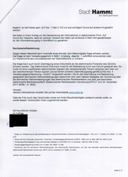 Stadt Hamm: Der Oberbürgermeister begehrt, so darf dieser gem. $ 6 Abs. 1 Satz 2 VIG nur aus wichtigem Grund auf andere Art gewährt werden. Sie baten in Ihrem Antrag um die ÜbersendungderInformationen in elektronischer Form. Auf Grund derTatsache, dassein sicherer Versand der Daten per einfacher E-Mail nicht gewährleistet ist, der Informationszugang in Schriftform zu gewähren. Rechtsbehelfsbelehrung: Gegendiesen Bescheid kann innerhalb eines Monats nach Bekanntgabe Klage erhoben werden. Die Klage ist beim Verwaltungsgericht in 59821 Arnsberg, Jägerstr. 1, schriftlich einzureichen oder zur Niederschrift des Urkundsbeamten der Geschäftsstelle zu erklären. Die Klage kann auch durch Übertragung eines Dokuments an die elektronische Poststelle des Gerichts erhoben werden. Das elektronische Dokument mussfür die Bearbeitung durch das Gericht geeignet sein. Es muss mit einer qualifizierten elektronischen Signatur der verantwortenden Person versehensein oder von der verantwortenden Personsigniert und auf einem sicheren Übermittlungsweg gemäß $ 55a Abs. 4 Verwaltungsgerichtsordnung -VwGO-* eingereicht werden. Die für die Übermittlung und Bearbeitung geeigneten technischen Rahmenbedingungenbestimmensich nach näherer Maßgabe der Verordnung über die technischen Rahmenbedingungen deselektronischen Rechtsverkehrs und über gas besondere elektronische Behördenpostfach (Elektronischer-Rechtsverkehr-Verordnung--ERVV)? vom 24. November 2017 (BGBl. | S. 3803). Hinweis: Weitere Informationen erhalten Sie auf der Internetseite www..justiz.de. Falls die Frist durch das Verschulden eines von Ihnen Bevollmächtigten versäumt werdensollte, so würde dessen Verschulden Ihnen zugerechnet werden. Mit freundlichen Grüßen Im Auftr ' Gesetz zur Verbesserung der gesundheitsbezogenen Verbraucherinformation (Verbraucherinformationsgesetz - VIG) vom 17. Oktober 2012 (BGBi. | S. 2166, 2725 ? Gesetz über den Vollzug des Lebensmittel-, Futtermittel- und Bedarfsgegenständerechts (LFBRVG NRW) vom 19. März 1985 (GV. NRW. S. 259 ? Verwaltungsverfahrensgesetz für das Land Nordrhein-Westfalen (VwVfG NRW) vom 12. November 1999 (GV. NRW. S. 602) “ Verwaltungsgerichtsordnung (VwGO) vom 19. März 1991 (BGBl. | S. 686) ® Verordnung über "die technischen Rahmenbedingungen des elektronischen Rechtsverkehrs und über das besondere elektronische Behördenpostfach (Elektronischer-Rechtsverkehr-Verordnung - ERVV) vom 24. November 2017 (BGBi. IS. 3803) -jeweils in der zurzeit geltenden Fassung- Seite 2/2